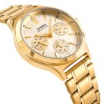 Zegarek CASIO LTP-V300G-1AUDF to połączenie luksusowego wyglądu i codziennej funkcjonalności. Jego elegancka bransoleta i dopracowana tarcza w matowej czerni sprawiają, że przyciąga wzrok i doskonale komponuje się z kobiecymi stylizacjami. Trzy dodatkowe subtarcze wskazują dzień tygodnia, datę i czas 24-godzinny, dzięki czemu zawsze masz wszystko pod kontrolą. To zegarek, który nie tylko zdobi nadgarstek, ale też ułatwia organizację dnia. Idealny dla kobiet, które lubią styl i wygodę w jednym.