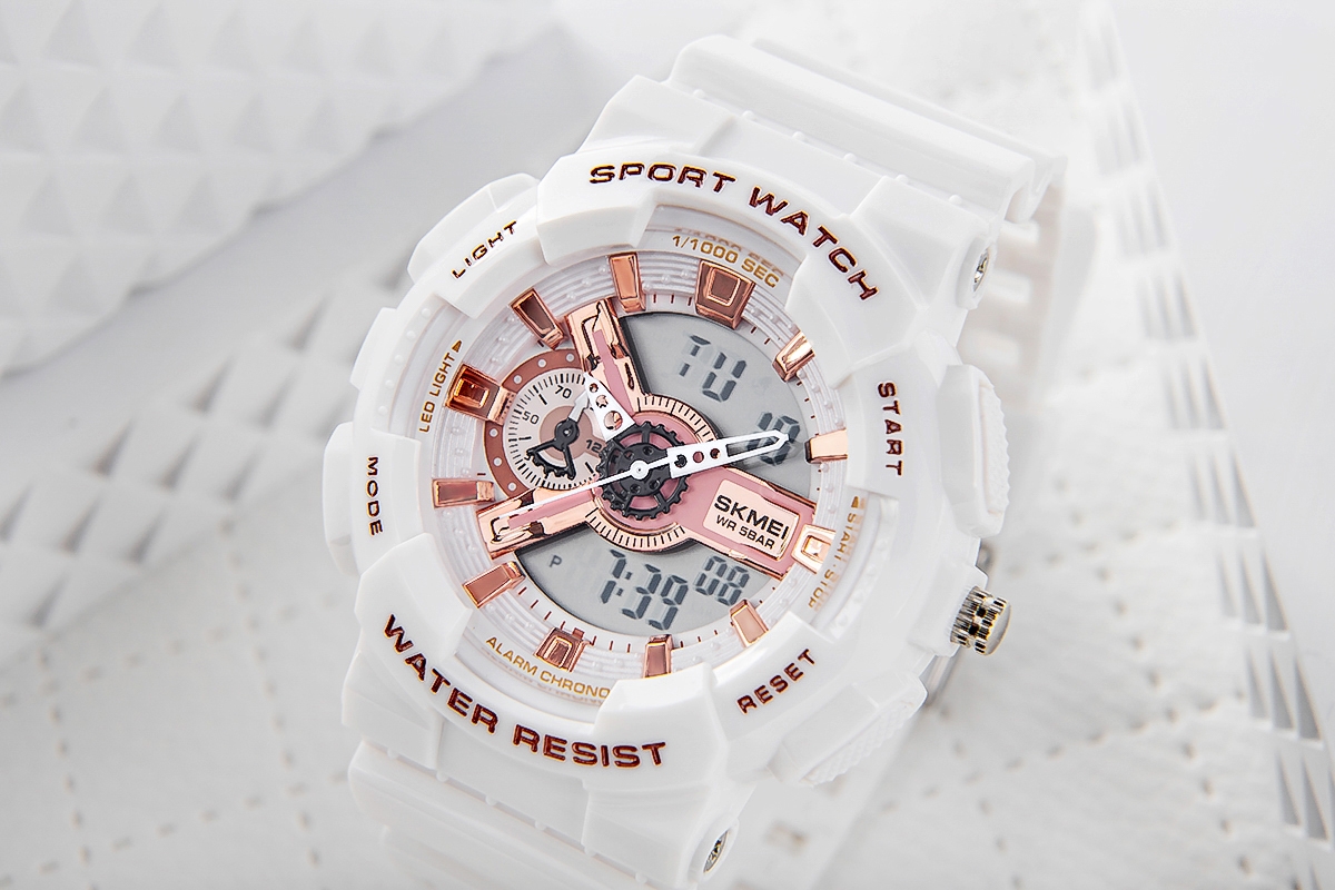 Solidny model o sportowym wyglądzie i białej kolorystyce. Posiada wyświetlacz cyfrowo-analogowy, z zielonymi sekcjami cyfrowymi oraz złoto-różowymi akcentami na elementach analogowych, co nadaje mu wyjątkowy styl. Idealny dla kobiet poszukujących wytrzymałego i funkcjonalnego zegarka sportowego o nowoczesnym designie.