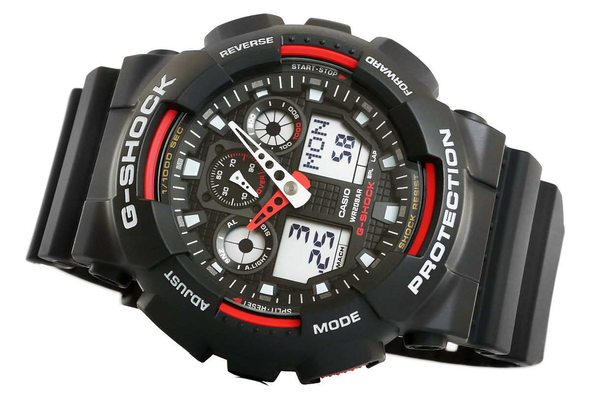 Zegarek Męski CASIO G-SHOCK GA-100-1A4ER wyposażony jest w: Stoper, Alarmx5, Budzik. Data.. Podświetlenie – do podświetlenia tego zegarka użyto diody LED, która stonowanym i jasnym światłem wystarczająco naświetli nam tarczę. Czas światowy, odczyt różnych stref czasowych. Kalendarz automatyczny z zaprogramowanymi datami do 2099r., Zegarek sam dostosowuje daty w przypadku krótszych miesięcy. Timer 1/10 – sec. Zegarek wyposażony jest w funkcję liczącą czas do tyłu, możliwość ustawienia od 1 sec do 24 godzin.