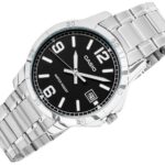 Męski model z kolekcji CASIO wyposażony w klasyczną 40-milimetrową kopertę ze stali nierdzewnej oraz czytelną tarczę z delikatną, pionową fakturą nadająca głębi. Wyraziste indeksy godzinowe, duże cyfry arabskie oraz dodatkowa skala minutowa na wewnętrznym pierścieniu gwarantuje świetną czytelność i ułatwiają orientację w czasie. Funkcjonalny datownik umieszczony przy godzinie trzeciej umożliwia szybki podgląd aktualnego dnia miesiąca, a wodoodporność na poziomie WR gwarantuje bezpieczeństwo użytkowania w codziennych sytuacjach. Dzięki bransolecie ze stali szlachetnej o matowym wykończeniu zegarek zyskuje elegancki charakter, który pasuje zarówno do garnituru, jak i do luźniejszego, miejskiego stylu. Mechanizm kwarcowy zapewnia precyzję i niezawodność, z której słynie marka Casio.