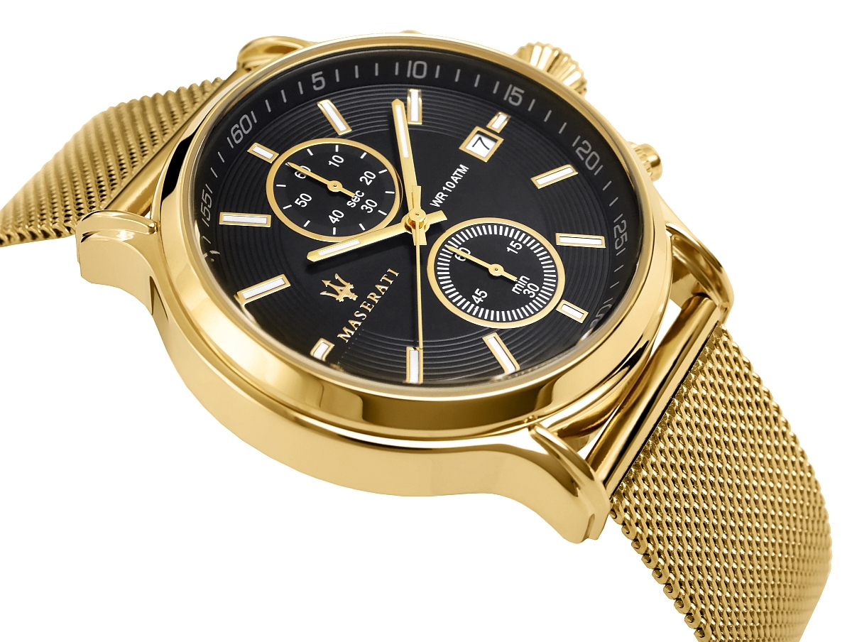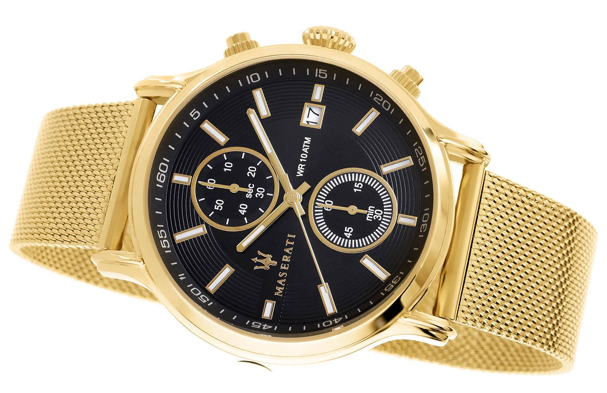 Bransoleta typu mesh, wykonana z odpornej na upływ czasu stali nierdzewnej, to prawdziwa esencja nowoczesnego stylu. Jej subtelny, a jednocześnie wyrazisty design doskonale przylega do nadgarstka, zapewniając komfort i pewność w każdej sytuacji. Chronografy i datownik nie tylko wzbogacają funkcjonalność zegarka Maserati, ale także znacząco zwiększają jego prestiż. Chronograf to jeden z najbardziej pożądanych elementów w zegarkach premium, a jego obecność świadczy o skomplikowanej mechanice i precyzji wykonania. Stylowy wygląd przycisków chronografu sprawia, że zegarek zyskuje na atrakcyjności, a jego wartość wzrasta. Klasę zegarka podkreśla dodatkowo elegancki sposób wyświetlania daty.