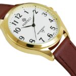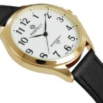 Ten zegarek to ucieleśnienie męskiej elegancji i wyrafinowanego stylu. Złota koperta emanuje luksusem, doskonale kontrastując z białą tarczą, która symbolizuje czystość i prostotę. Czarne indeksy oraz wskazówki nadają mu zdecydowanego charakteru, zapewniając jednocześnie doskonałą czytelność, co czyni go niezastąpionym towarzyszem w każdej sytuacji.