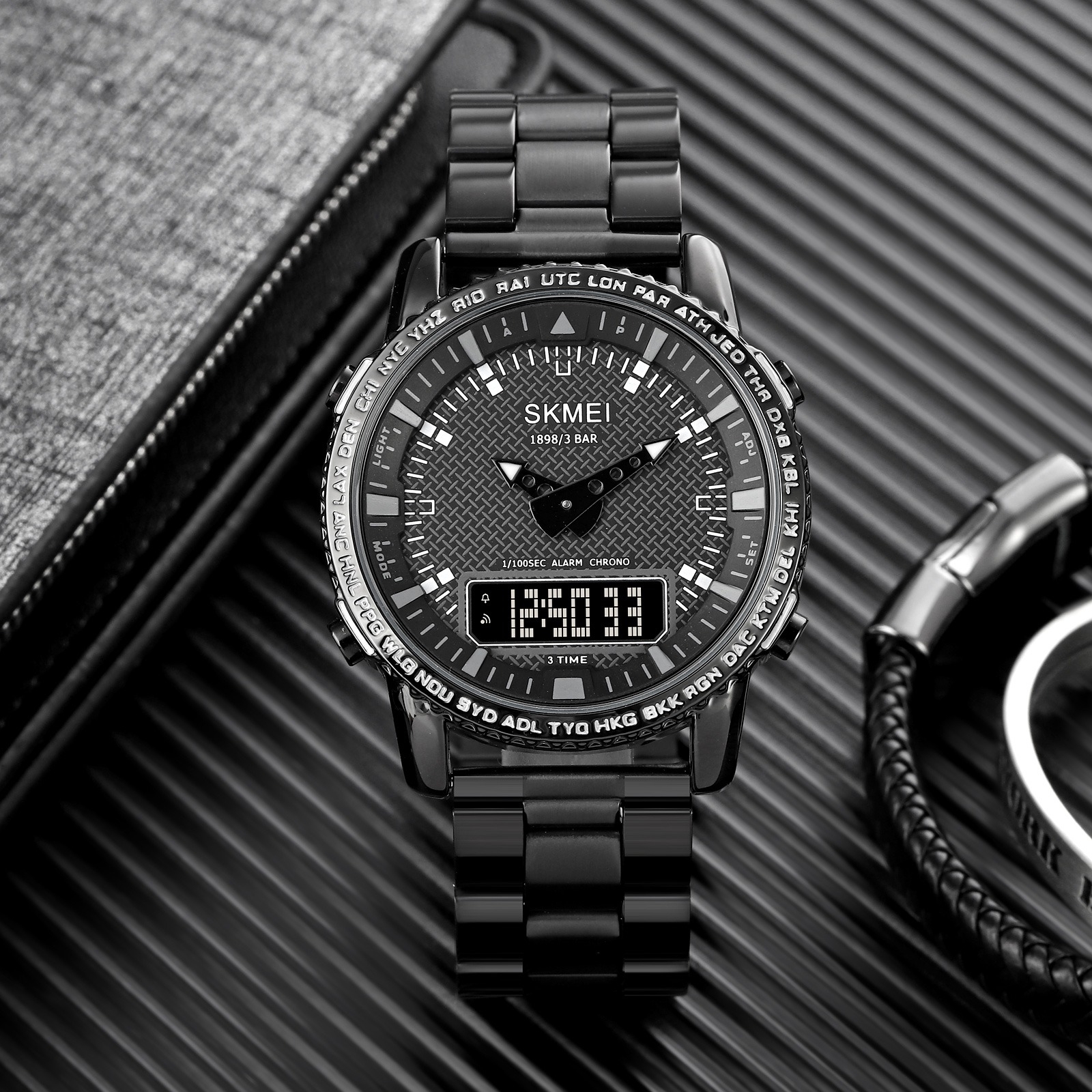 Zegarek Skmei to prawdziwe narzędzie do zarządzania męskim czasem – funkcjonalny i niezawodny, zaprojektowany z myślą o mężczyźnie, który potrzebuje czegoś więcej niż tylko wskazania godziny. Teksturowana tarcza nadaje mu głębi i surowego, męskiego charakteru, wyróżniając go spośród typowych, gładkich modeli.Obramowanie z wygrawerowanymi skrótami miast i stref czasowych, takich jak NYC, LON, czy SYD, podkreśla jego globalny styl i przydatność dla mężczyzny, który żyje i działa na poziomie międzynarodowym.