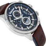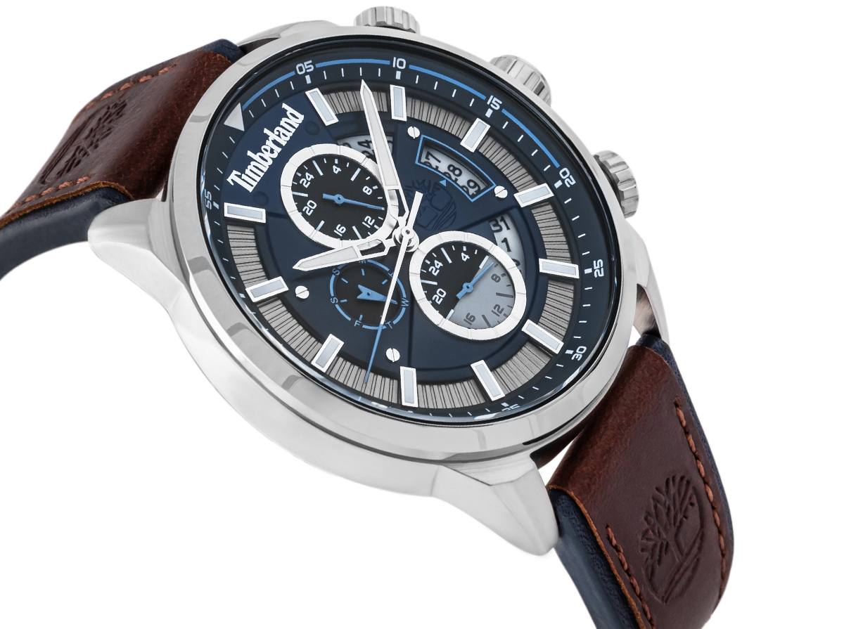 TIMBERLAND Callahan to model, który przyciąga spojrzenia detalami i zachowuje terenowy charakter marki – surowy, męski, ale z nutą nowoczesnej elegancji. Stalowa koperta o średnicy 46 mm kryje w sobie granatową tarczę o wielowarstwowej strukturze, z dynamicznymi, srebrnymi indeksami i chronografem w układzie 3-tarczowym. Do tego niezwykle czytelny datownik w pionowym oknie i kompasowa wskazówka kierunku (S/W/E/N) na dolnej subtarczy – to detale, które robią różnicę. Pasek wykonano z wysokiej jakości skóry naturalnej licowej w odcieniu ciemnego brązu typu saddle, z tłoczonym logo Timberland i mocnymi przeszyciami. Całość to ukłon w stronę outdoorowego dziedzictwa marki – inspirowany kultowymi butami Timberland i stworzony z myślą o wytrzymałości. Dzięki wodoodporności 5 ATM zniesie nie tylko codzienność w miejskiej dżungli, ale i wypady w teren. W zestawie otrzymujesz także praktyczny worek/plecak w stylu Timberland – lekki, funkcjonalny i gotowy na każdą przygodę.