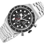 Tarcza w głębokiej czerni robi świetne wrażenie – matowe wykończenie i delikatna struktura nadają jej głębi i charakteru. Trzy subtarcze są rozmieszczone harmonijnie i tworzą czytelną, uporządkowaną kompozycję: technicznie, ale bez chaosu. Minimalistyczne indeksy, wyraziste wskazówki i wtopiony datownik podkreślają nowoczesny, funkcjonalny styl.
