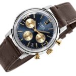 Przedstawiamy najnowszą odsłonę modelu Timex Waterbury Classic, teraz wyposażoną w zaawansowany kwarcowy mechanizm z fazami księżyca, który w elegancki sposób śledzi cykl lunarny na subtarczy umieszczonej tuż nad godziną 6. Niebieska tarcza typu sunray została wzbogacona o pełne cyfry arabskie oraz świecące w ciemności wskazówki, całość chroniona jest szkłem mineralnym. Srebrzysta koperta ze stali nierdzewnej o średnicy 40 mm idealnie współgra ze złotą koronką i brązowym paskiem z naturalnej, ekologicznej skóry (pozyskiwanej zgodnie ze standardami Leather Working Group), wyposażonym w szybkozłączki. To elegancka komplikacja faz księżyca nie tylko wzbogaca wygląd tarczy, ale też dodaje zegarkowi klasy i funkcjonalnego uroku – szczególnie dla miłośników astronomii i ponadczasowego designu.