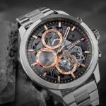 Model, który robi wrażenie od pierwszego spojrzenia dzięki swojej skeletonowej tarczy, odsłaniającej dynamiczną grę mechanicznych detali. Dodatkowo zegarek wyposażony jest w funkcjonalności takie jak datownik, 24-godzinny format czasu i czytelne indeksy, Wyrazisty design i surowa elegancja tego modelu czynią go dodatkiem, który nie tylko odmierza czas, ale także przyciąga podkreśla męski charakter w każdej sytuacji.