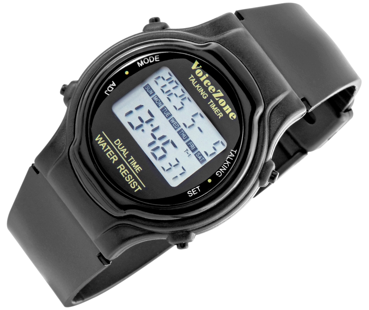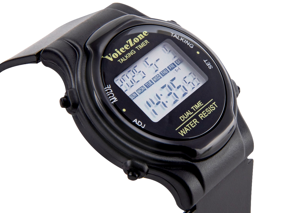 Zegarek informuje głosowo o aktualnym czasie w dwóch strefach czasowych – świetna opcja np. przy kontakcie z rodziną za granicą. Ma również mówiący budzik z funkcją drzemki (dobudzania) oraz głosowy timer – przydatny w kuchni, podczas ćwiczeń lub na spacerze.