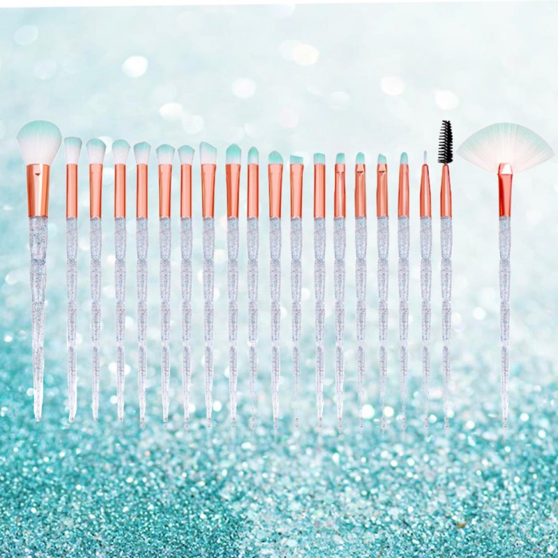 Aby uzyskać w łatwy sposób wspaniały i efektowny makijaż proponujemy Ci zestaw 20 pędzli do makeup’u W zestawie 17 precyzyjnych pędzelków do makijażu oczu, szczoteczka do brwi oraz 2 większe pędzle do twarzy. Włosie pędzli osadzone jest przy pomocy skuwki w kolorze miedzianym na transparentnym trzonku z zatopionym wewnątrz kolorowym brokatem.