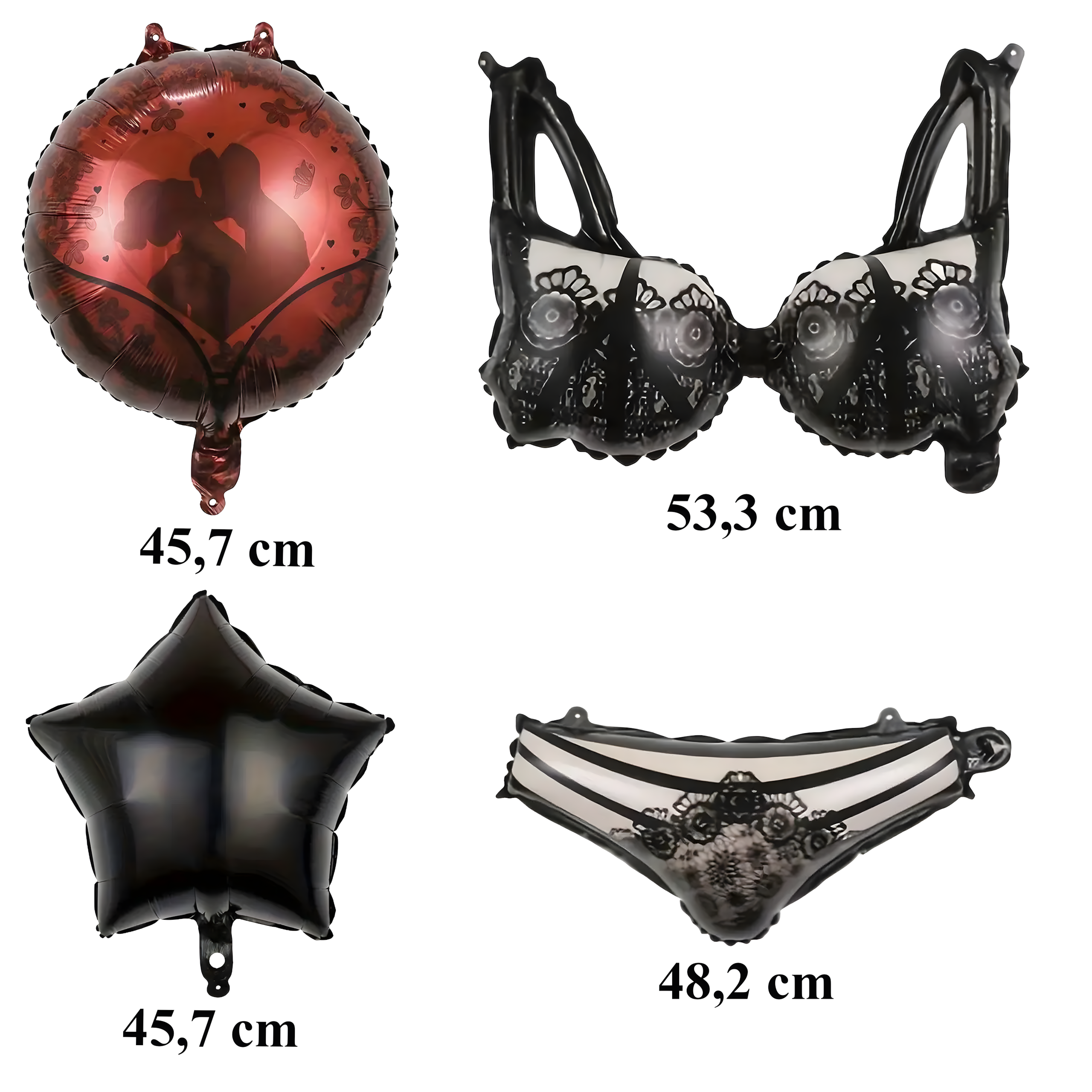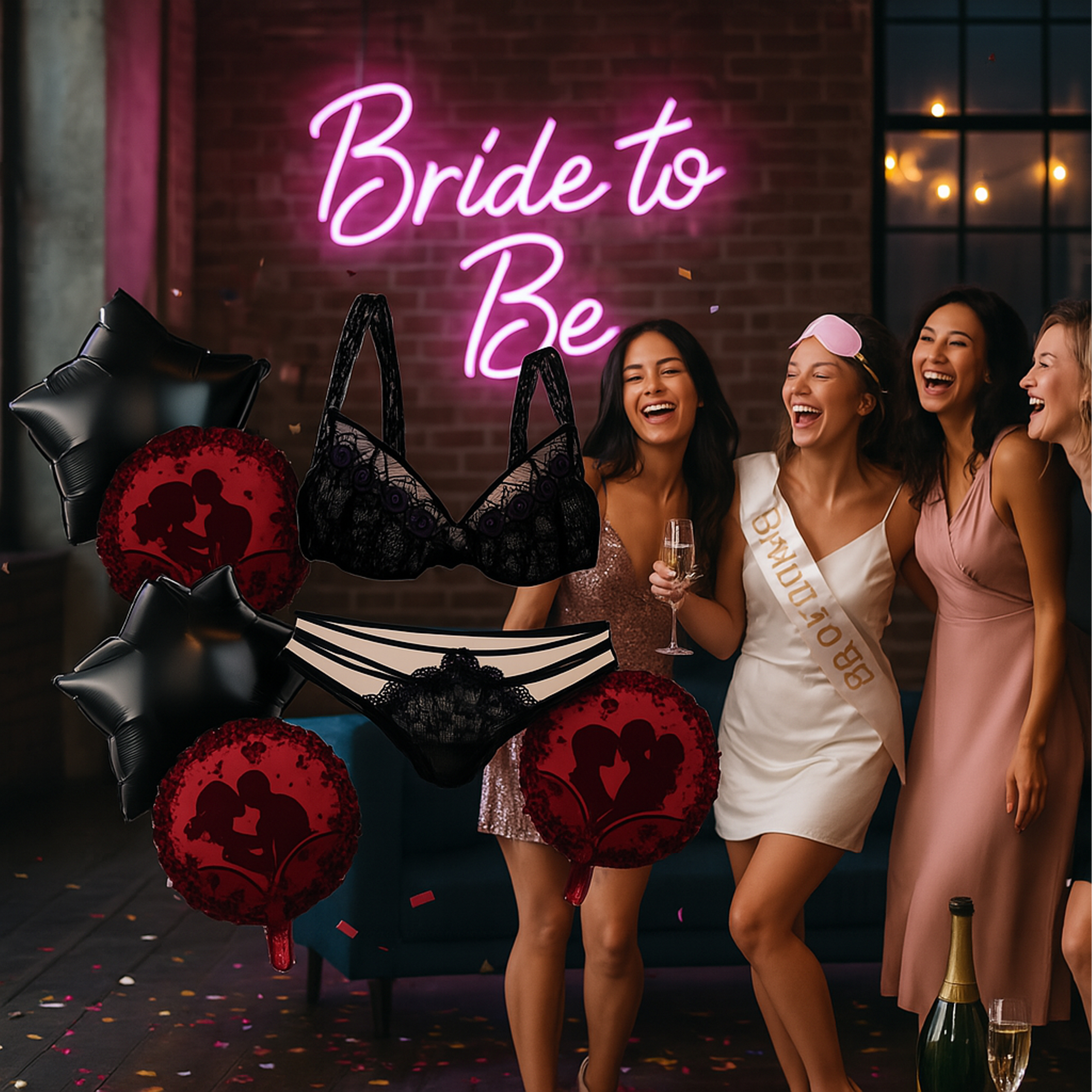 Zestaw balonów na wieczór panieński (6 szt.) – biustonosz 53,3 cm, majtki 48,2 cm, 2 okrągłe i 2 z nadrukiem. Idealna, zabawna dekoracja do fotobudki i imprezy Bride-to-Be!