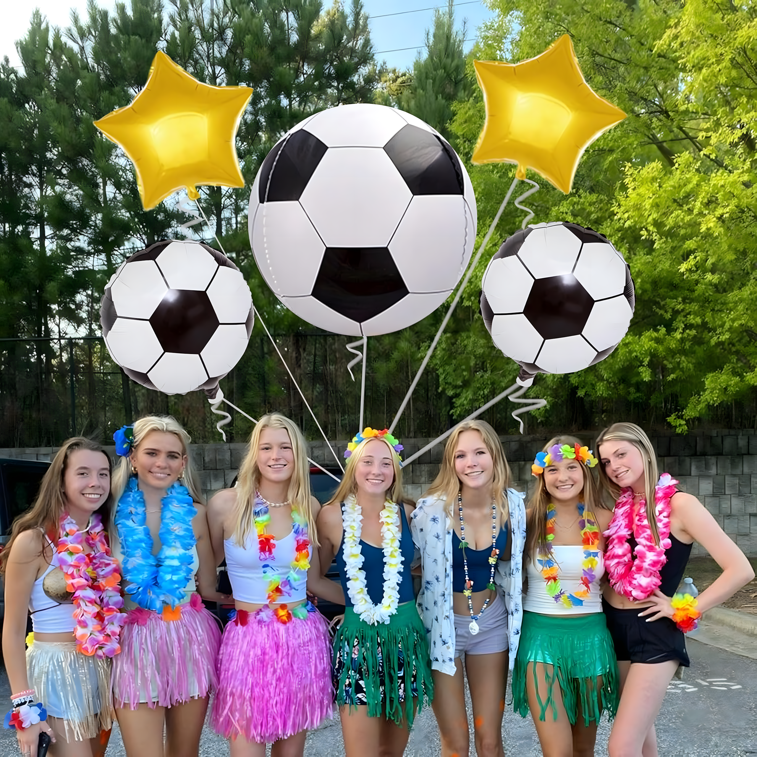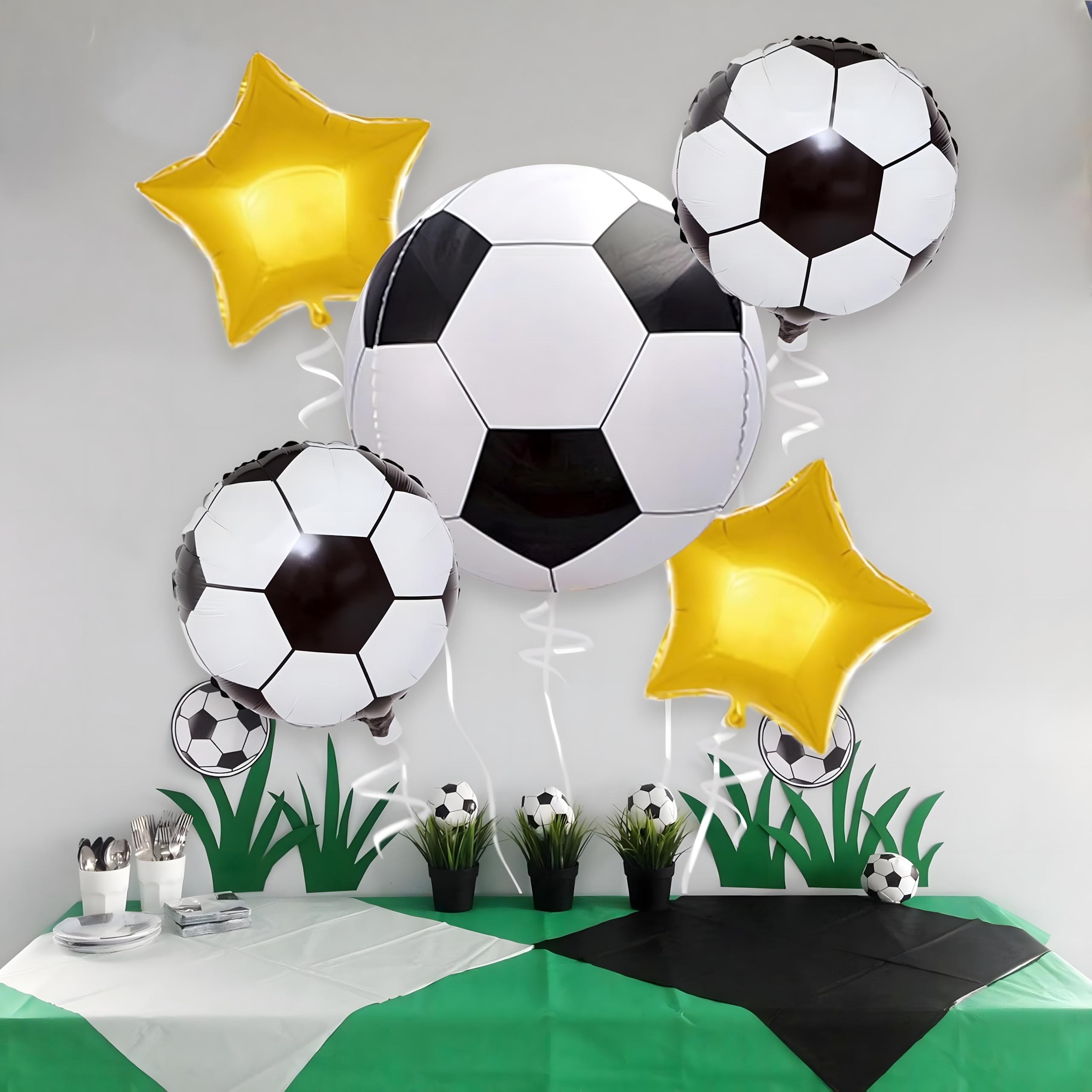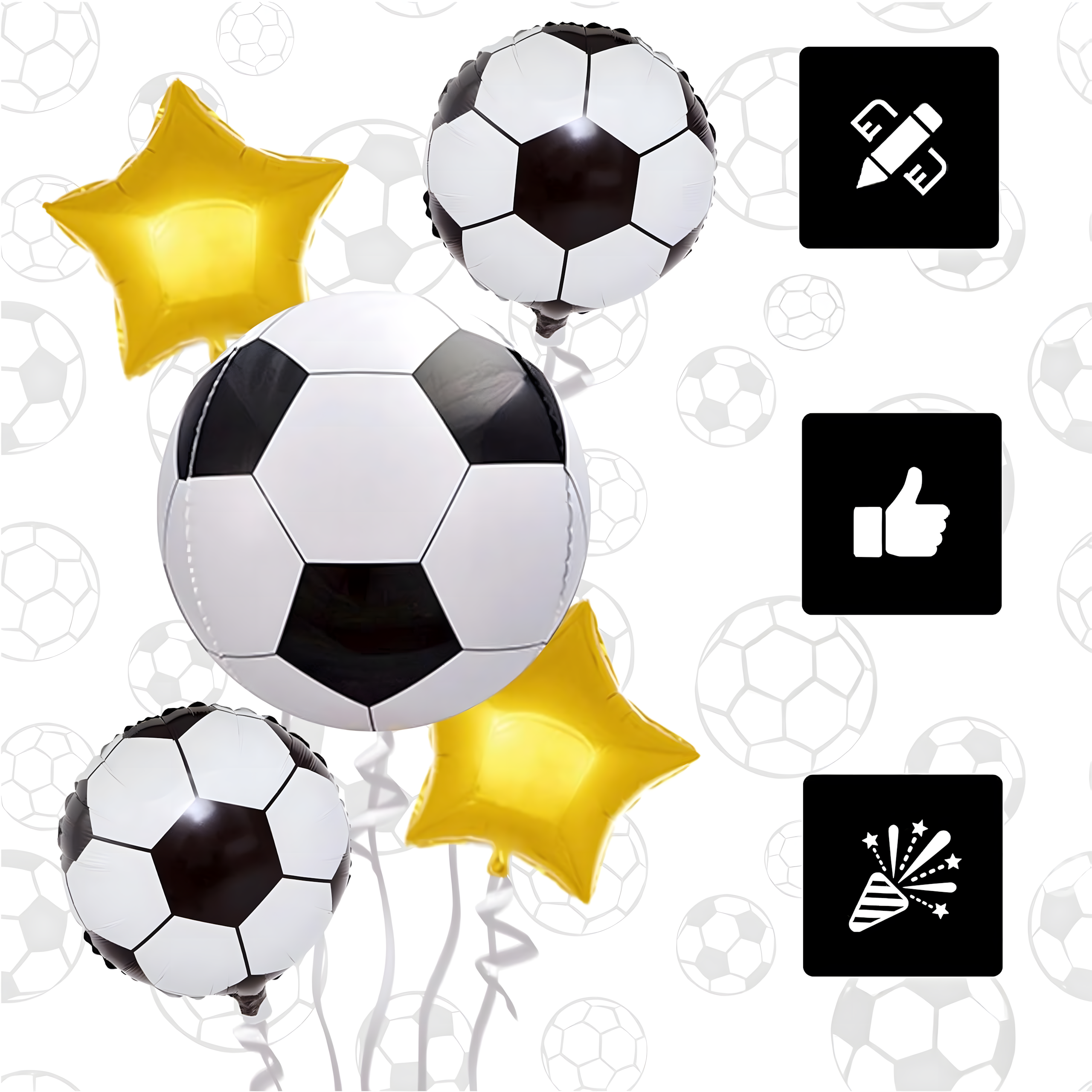 Zestaw balonów piłka nożna 5 szt. – duża piłka 55,8 cm, 2 balony piłki 45,7 cm i 2 złote gwiazdki 45,7 cm. Idealna dekoracja urodzinowa dla fana futbolu!