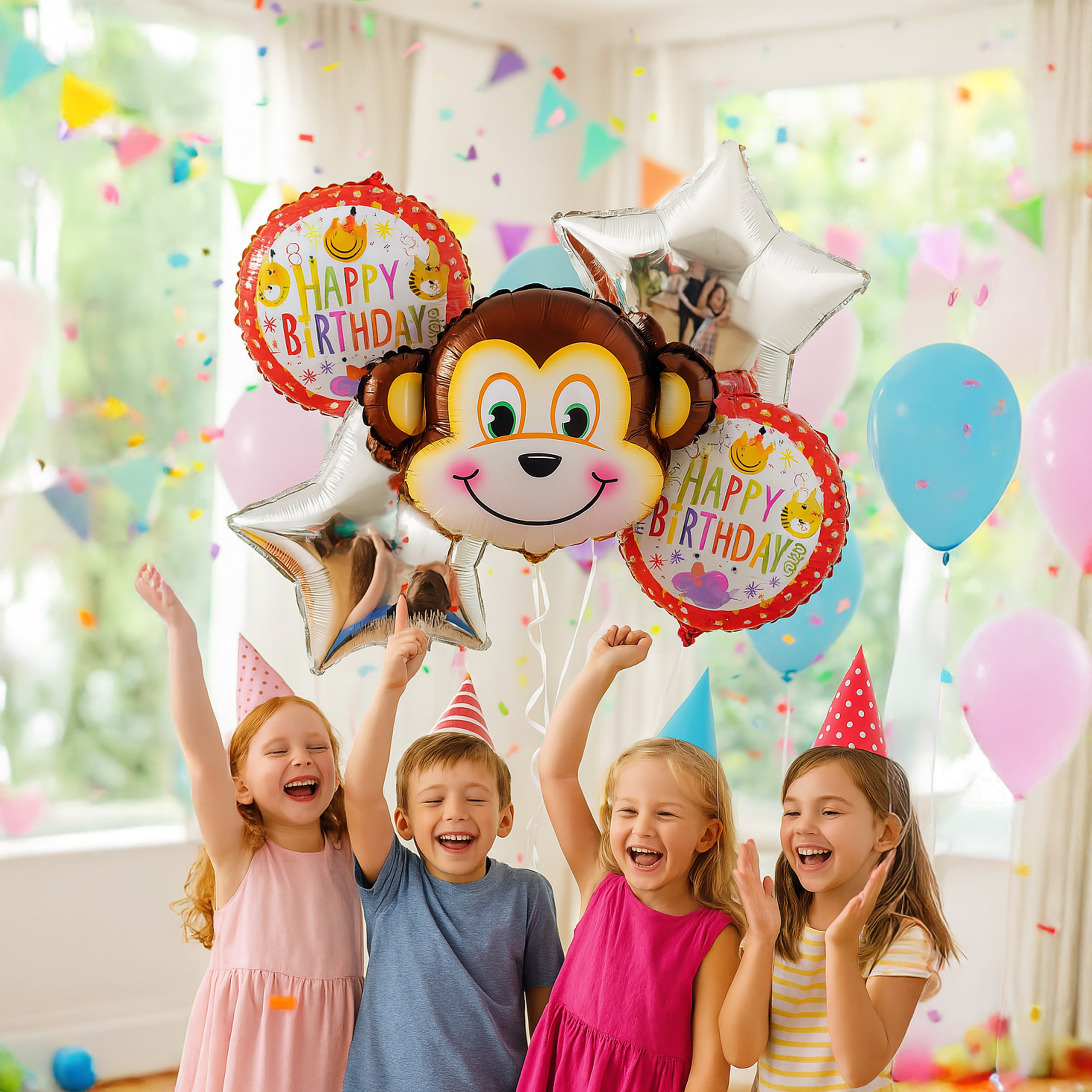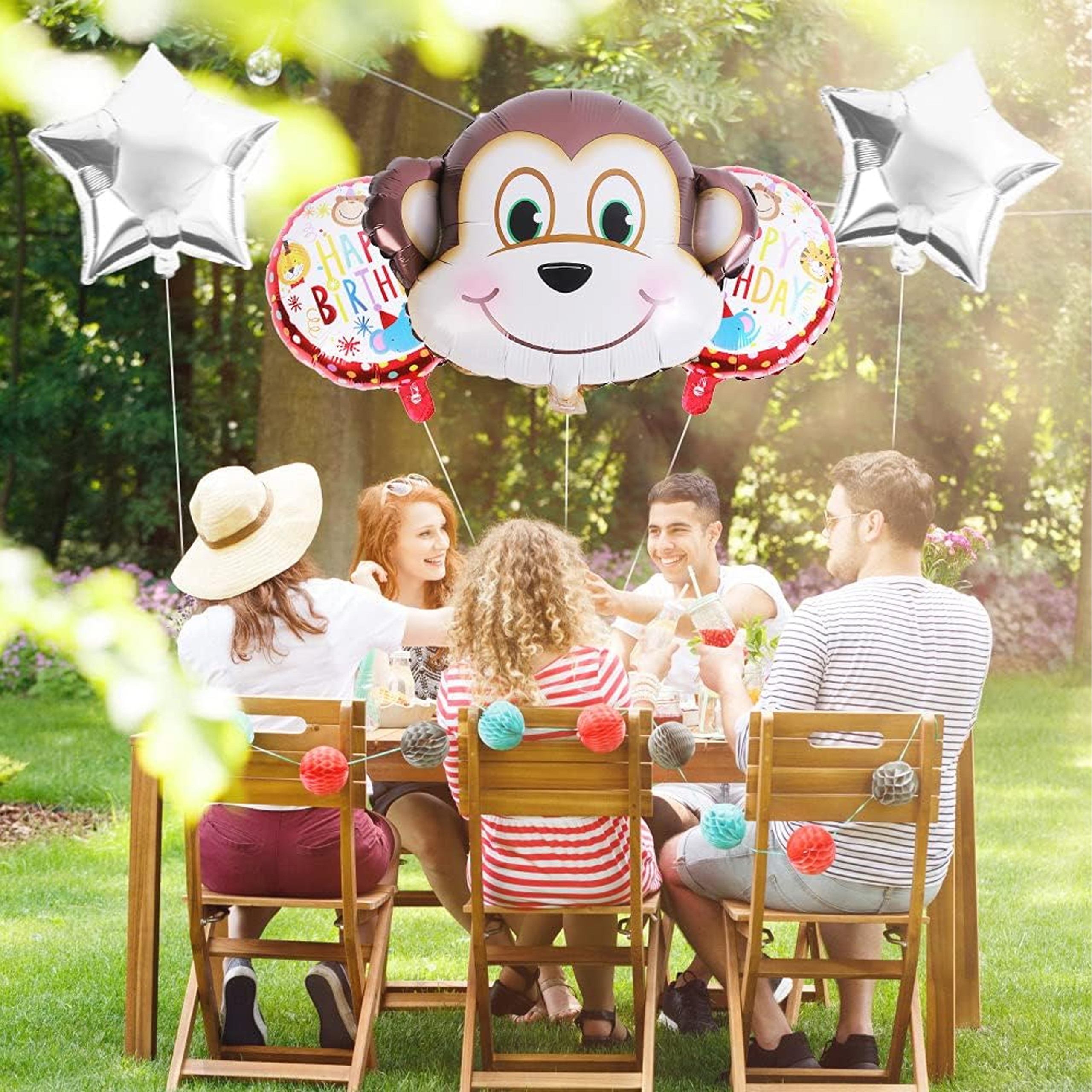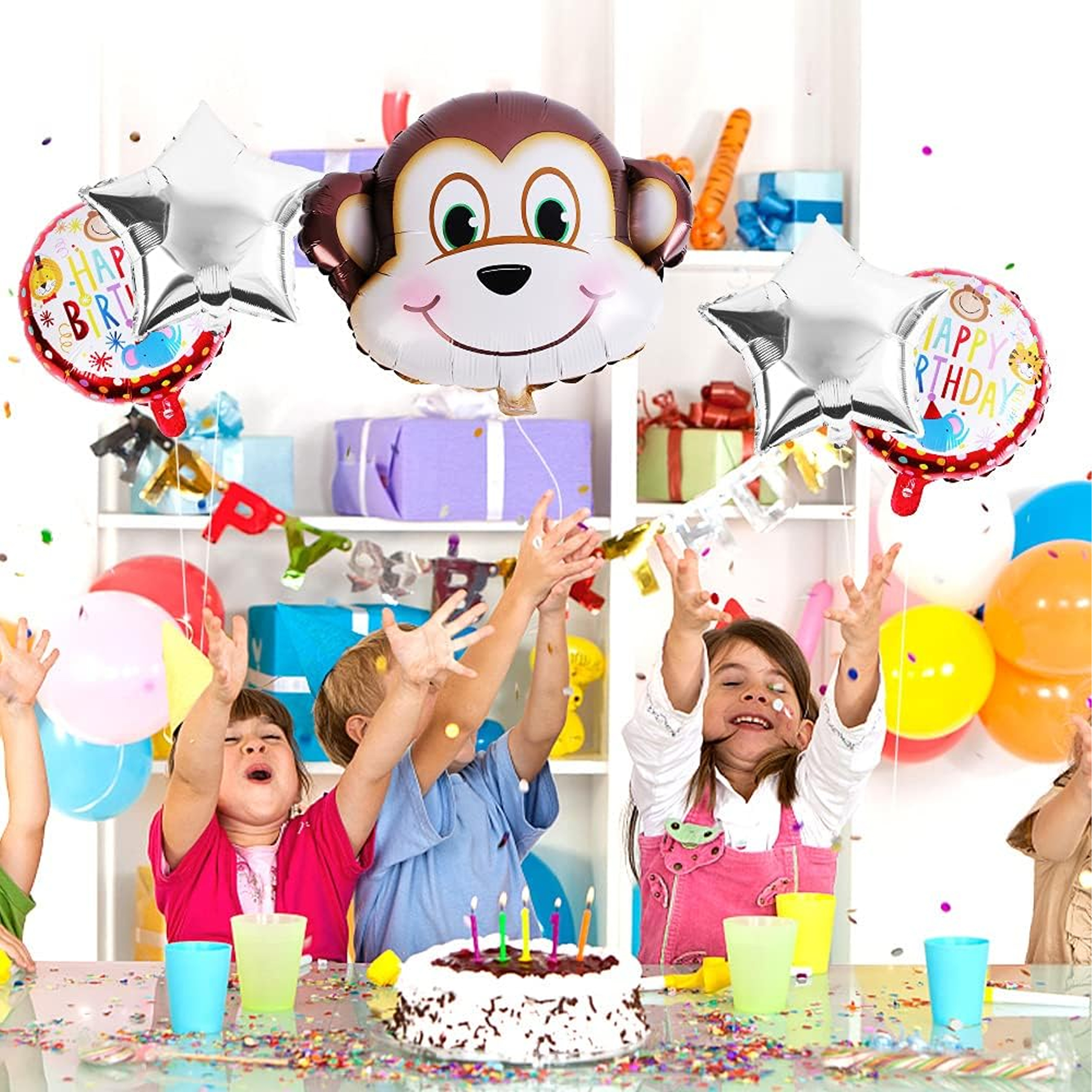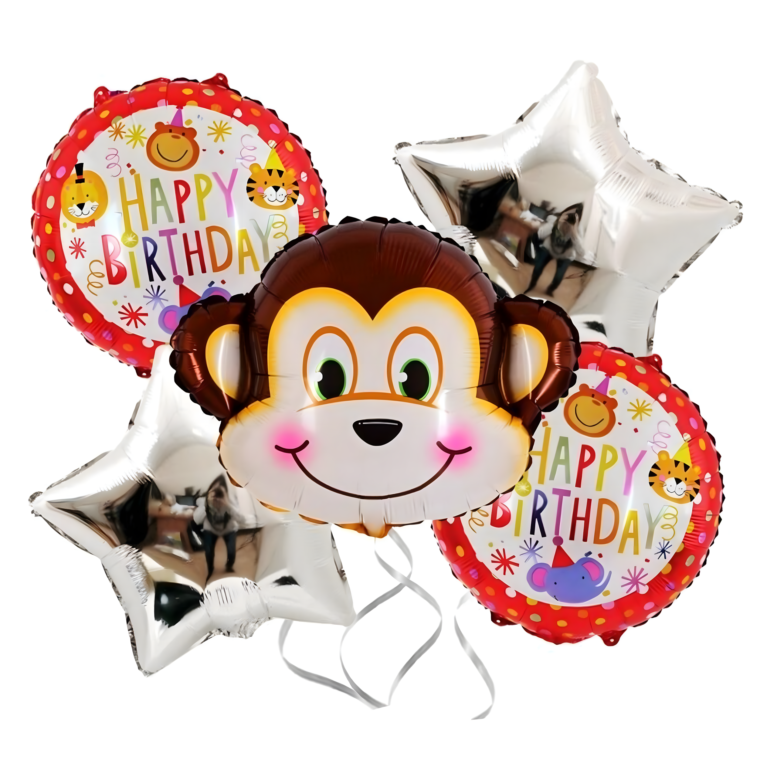 Zestaw balonów urodzinowych Małpka 5 szt. – 1 balon małpka, 2 „HAPPY BIRTHDAY” i 2 srebrne gwiazdki. Idealna, wesoła dekoracja na dziecięce urodziny i imprezy w stylu zoo/dżungli!