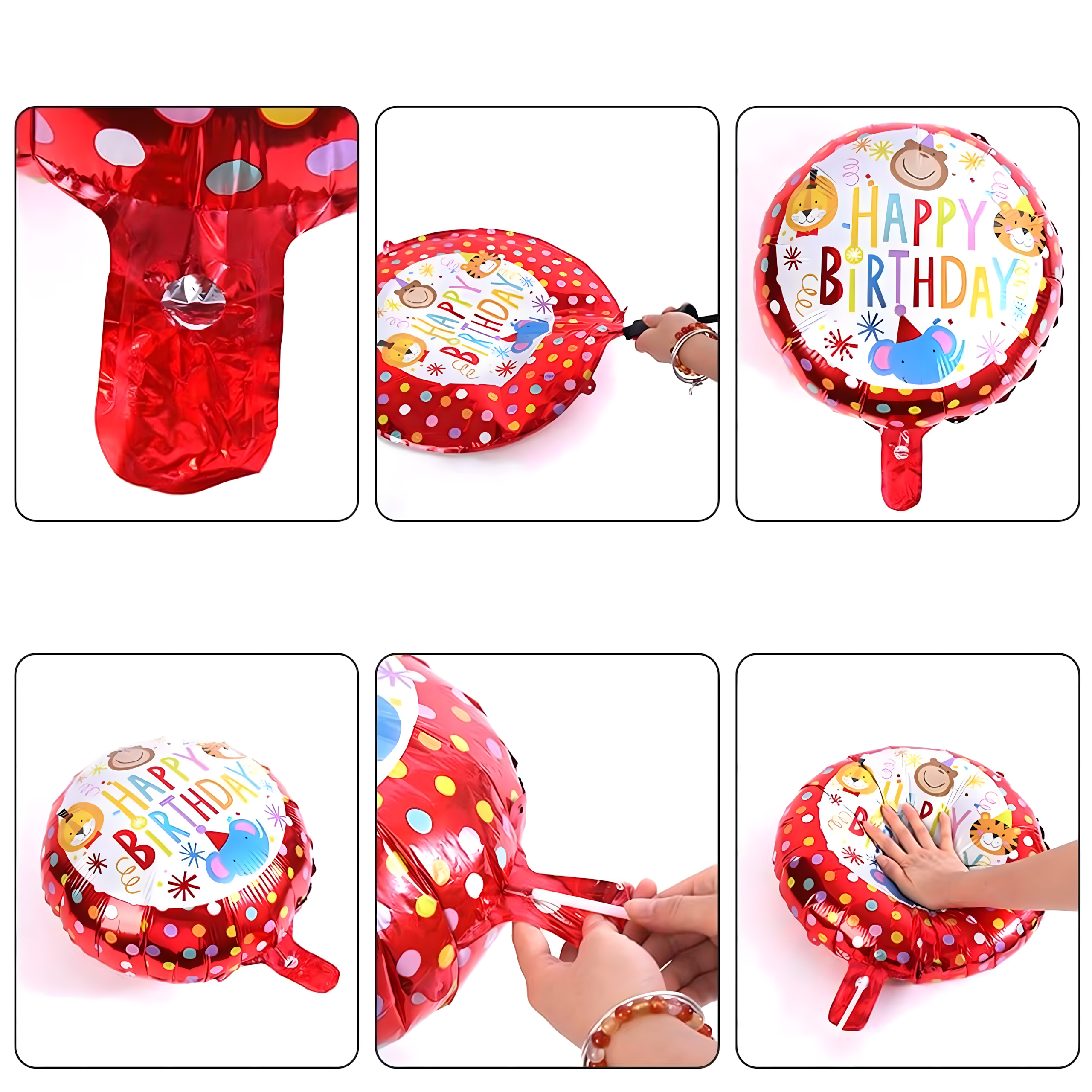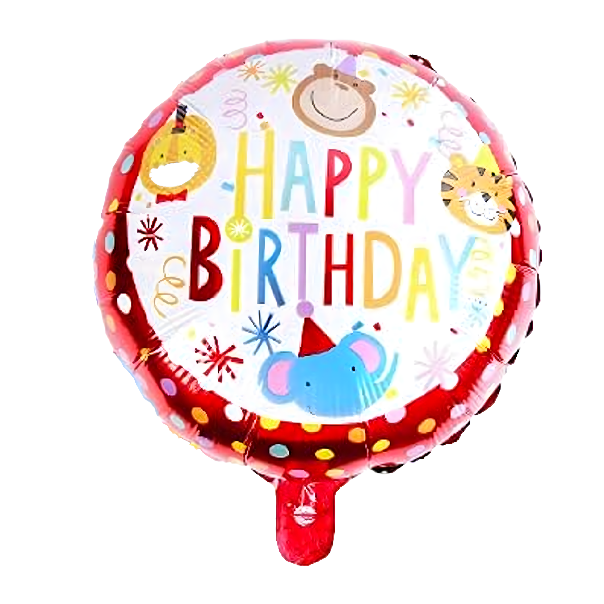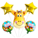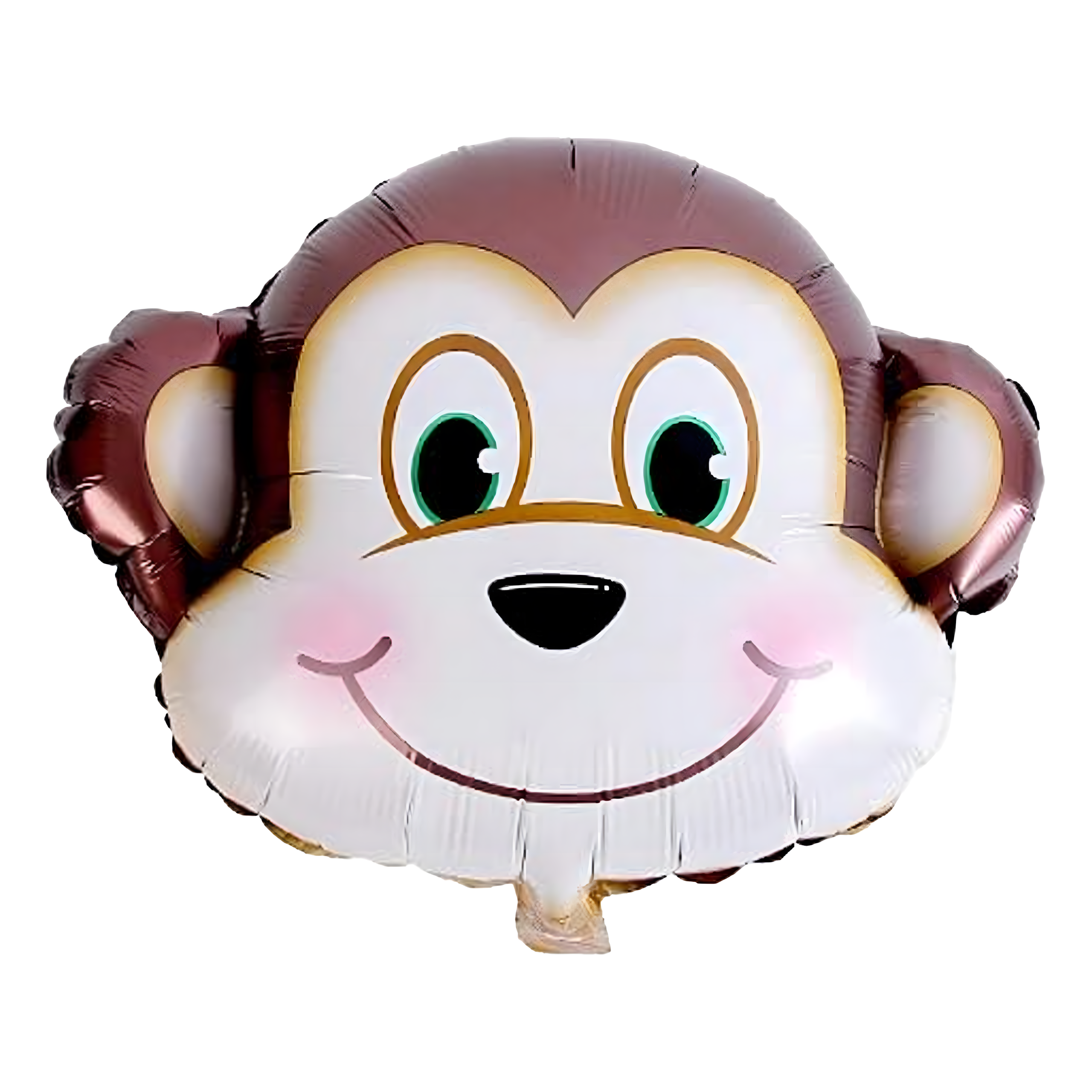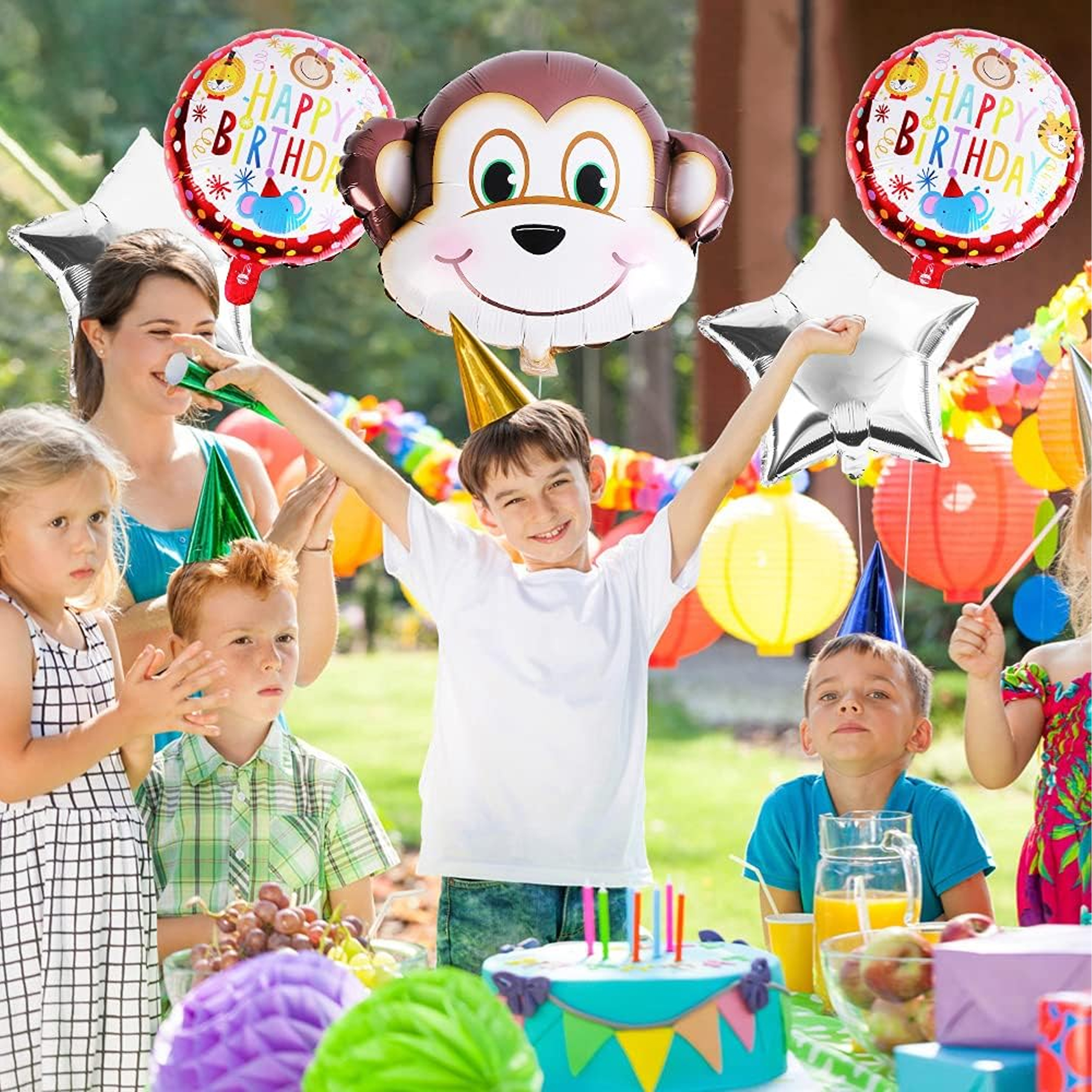 Zestaw balonów urodzinowych Małpka 5 szt. – 1 balon małpka, 2 „HAPPY BIRTHDAY” i 2 srebrne gwiazdki. Idealna, wesoła dekoracja na dziecięce urodziny i imprezy w stylu zoo/dżungli!