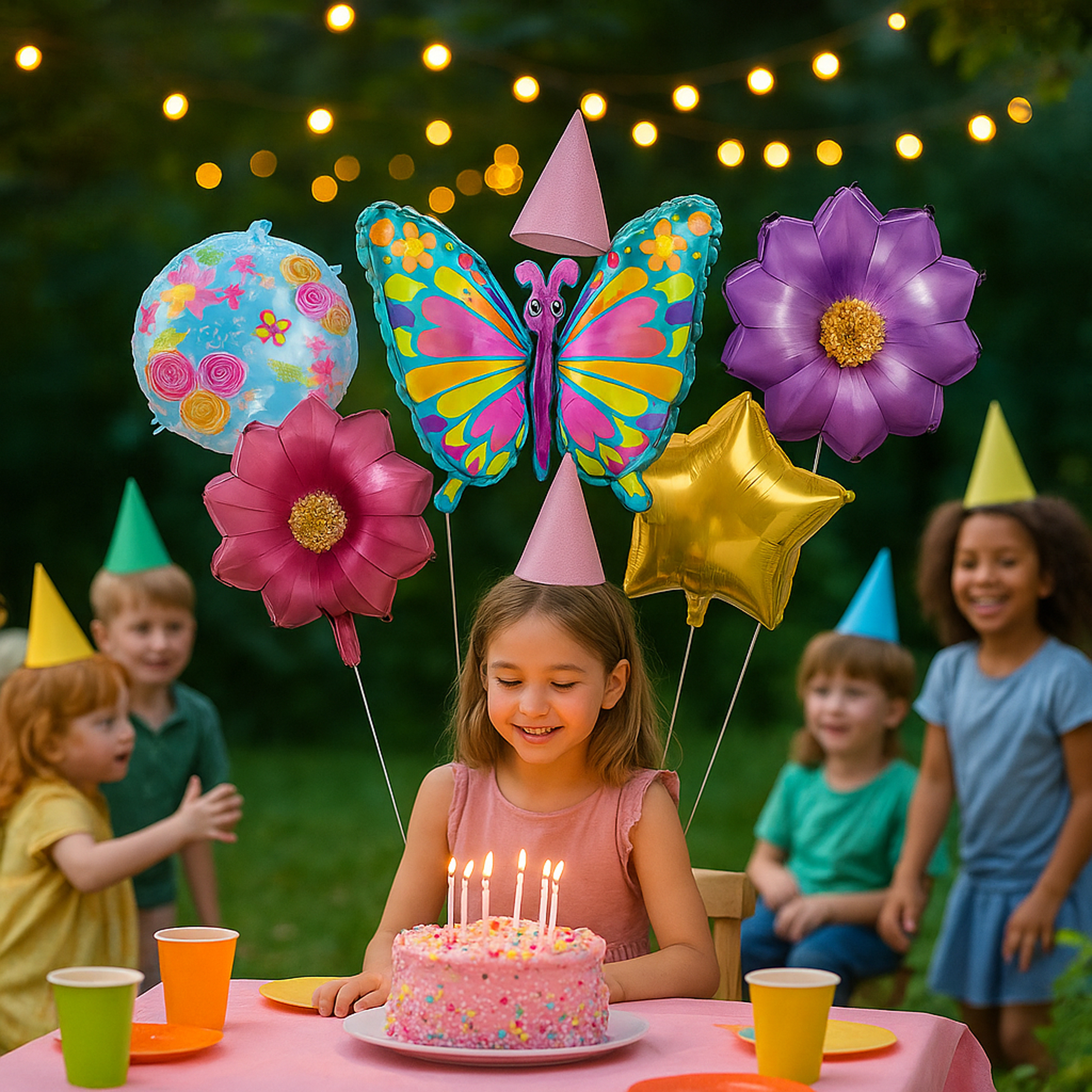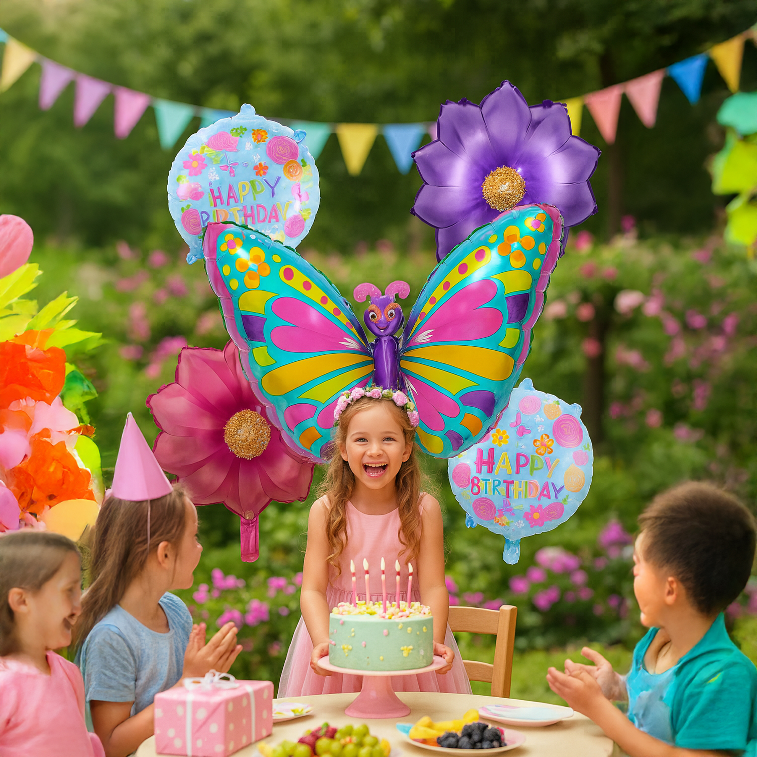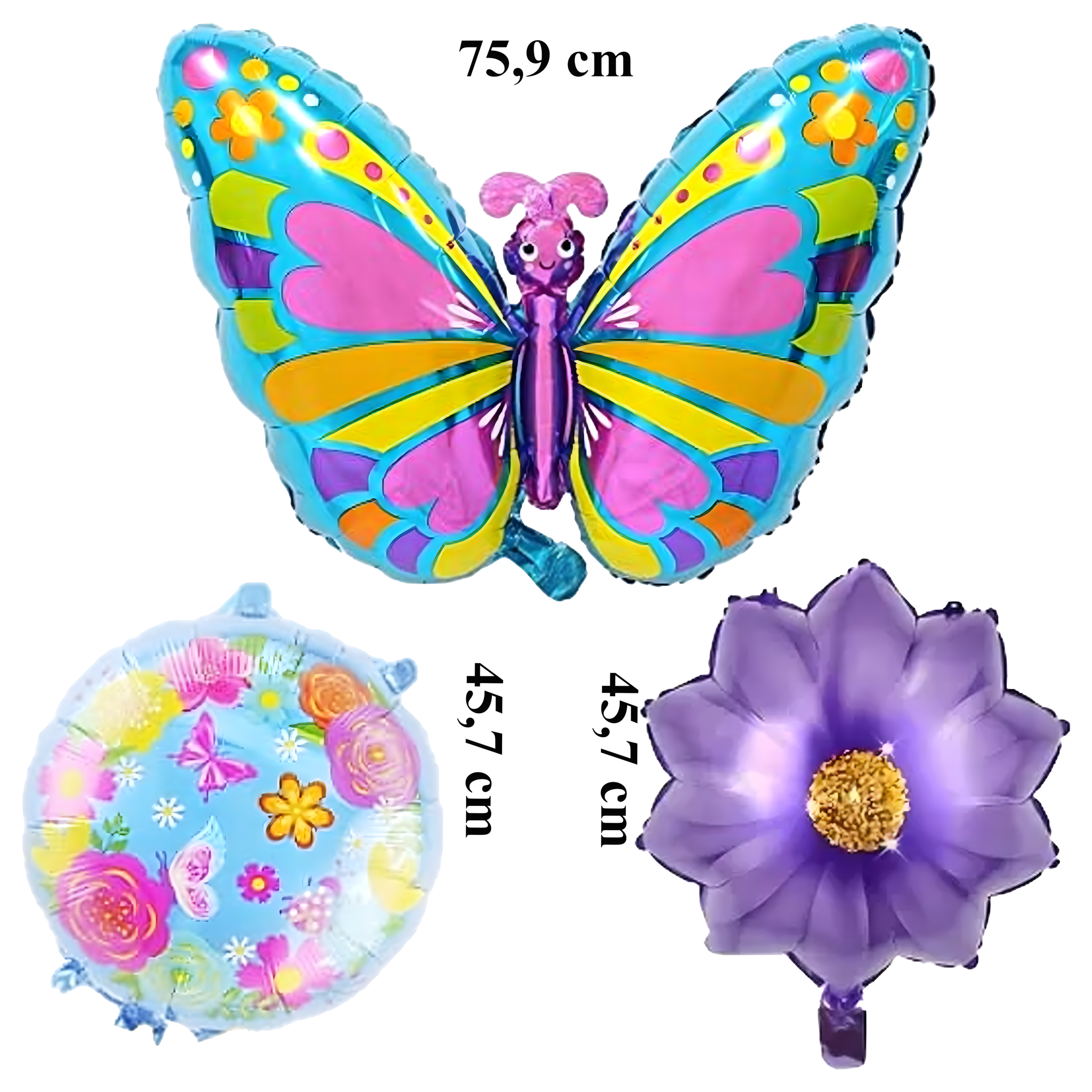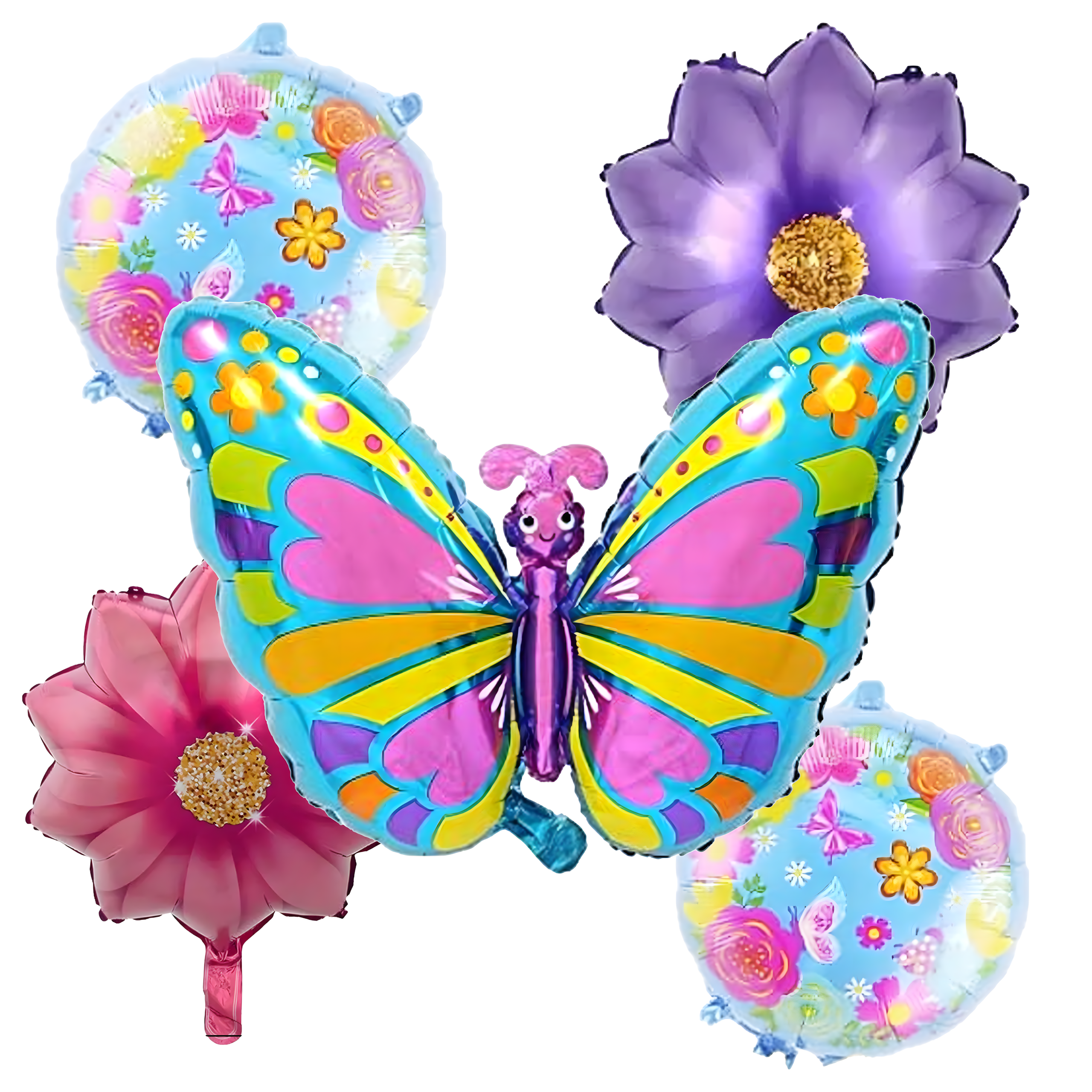 Zestaw balonów Motylek 5 szt. – duży kolorowy motyl (75,9 cm), 2 balony-kwiatki i 2 okrągłe z nadrukiem (45,7 cm). Idealna, bajkowa dekoracja na dziewczęce urodziny i przyjęcia!