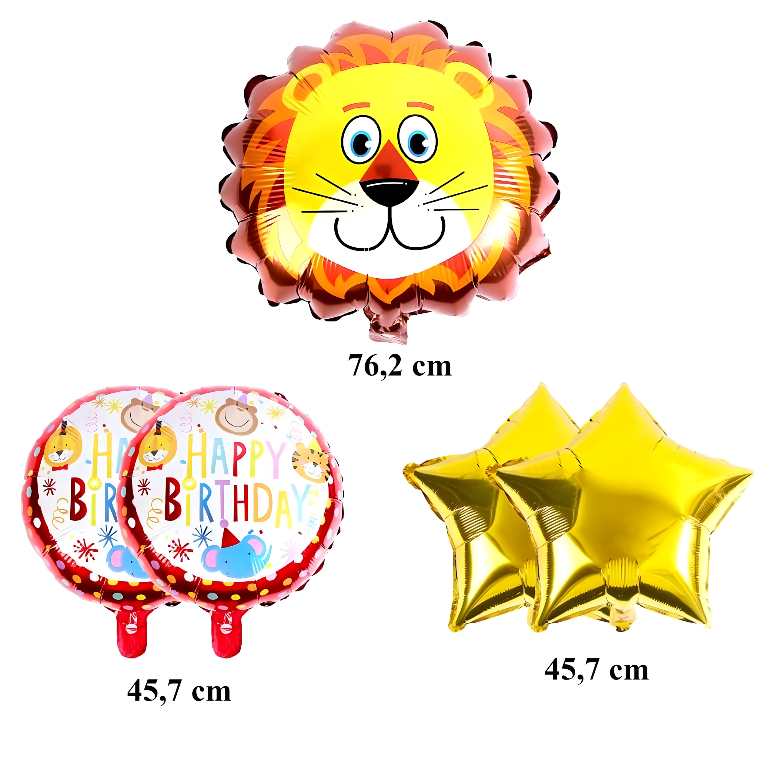 Zestaw balonów urodzinowych – Lew 5 szt. 1 balon lew, 2 balony „HAPPY BIRTHDAY” i 2 złote gwiazdki. Idealna, kolorowa dekoracja na dziecięce urodziny i przyjęcia w stylu zoo/safari!