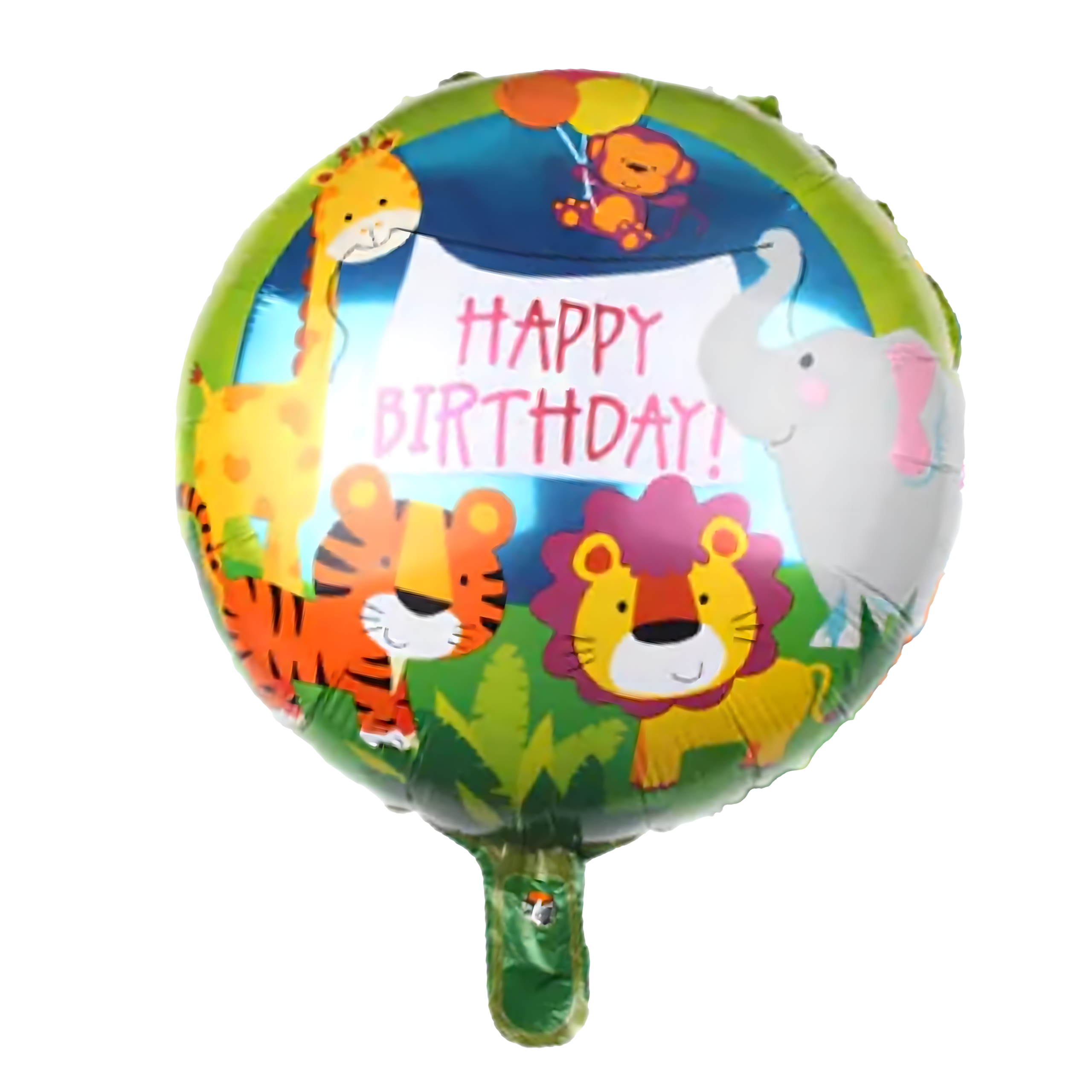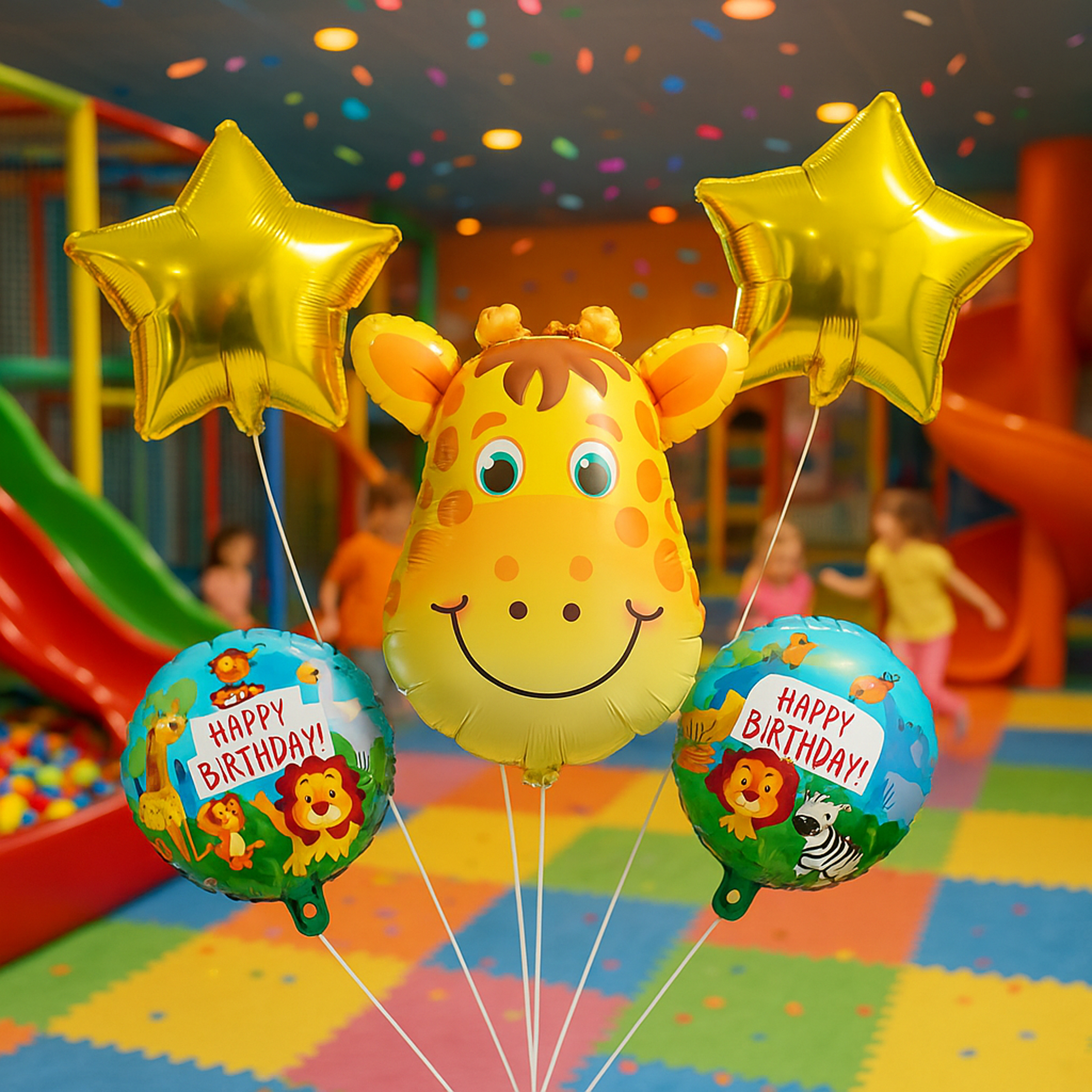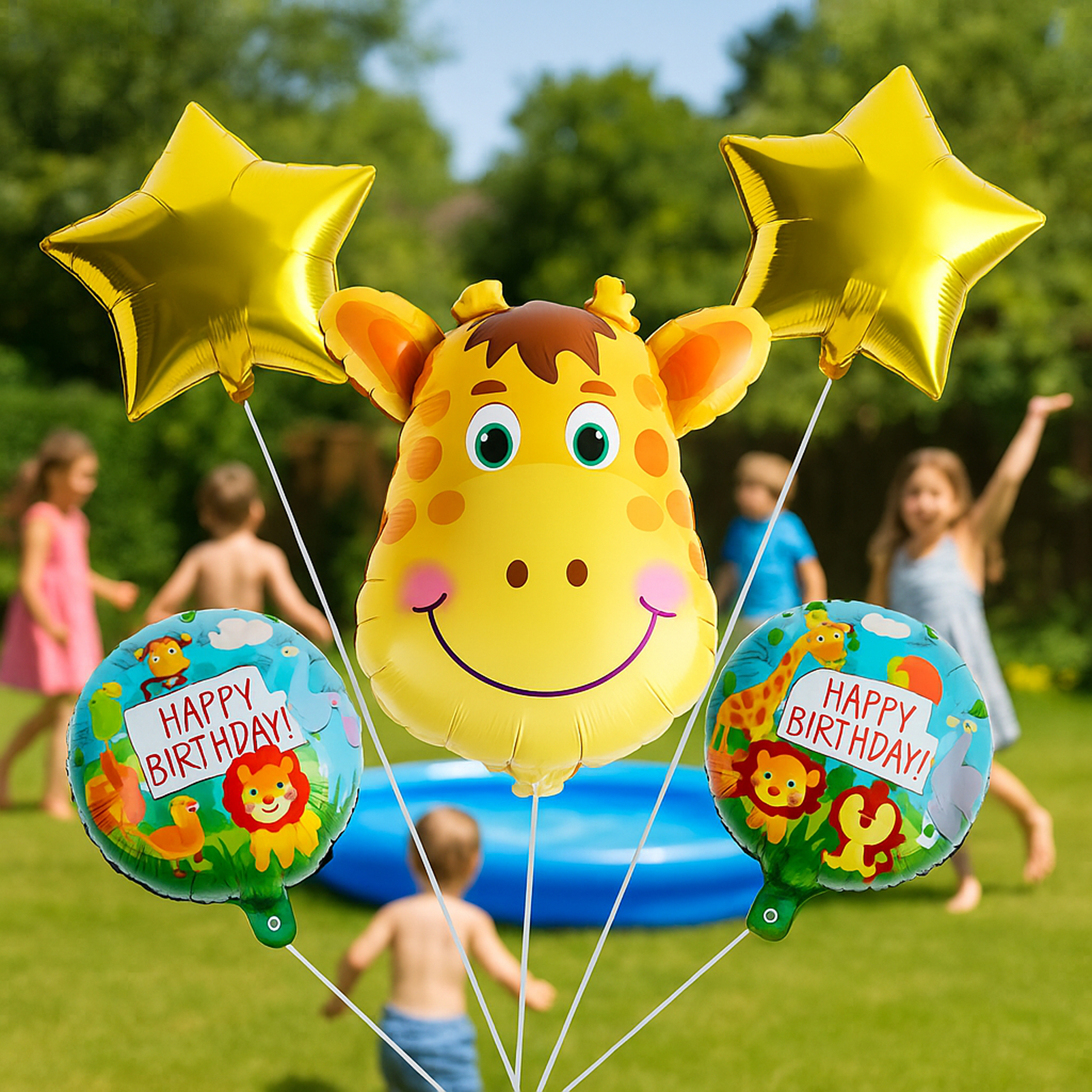 Zestaw balonów urodzinowych – Żyrafa 5 szt. 1 balon żyrafa, 2 balony „HAPPY BIRTHDAY” i 2 złote gwiazdki. Idealna, kolorowa dekoracja na dziecięce urodziny i przyjęcia w stylu zoo/safari!