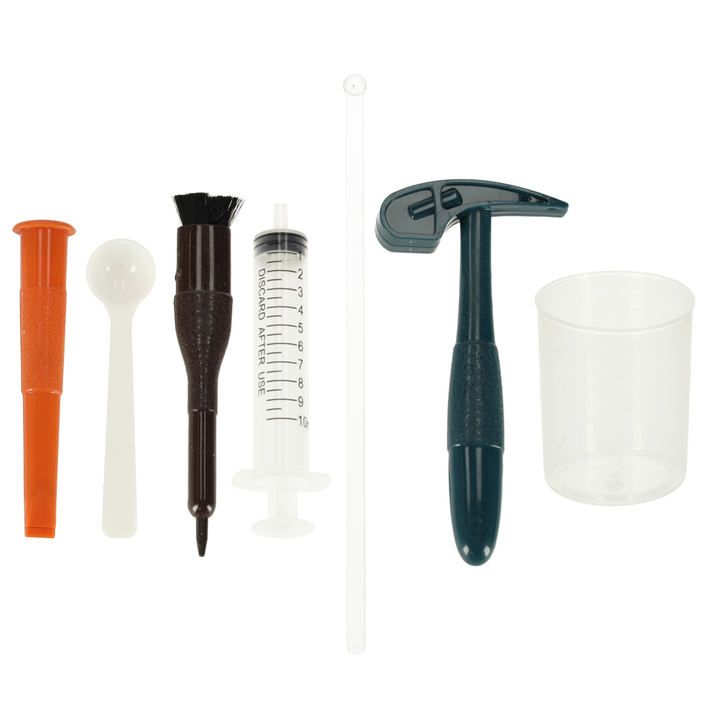 młotek, dłuta oraz pędzelek, dzięki którym młody odkrywca może