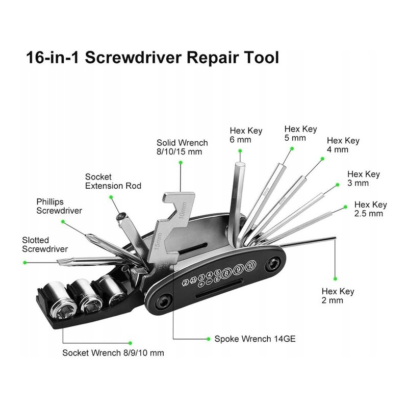 Zestaw kluczy rowerowych 16W1 Zestaw zawiera: 6 kluczy imbusowych: 2mm, 2,5mm, 3mm, 4mm, 5mm, 6 mm