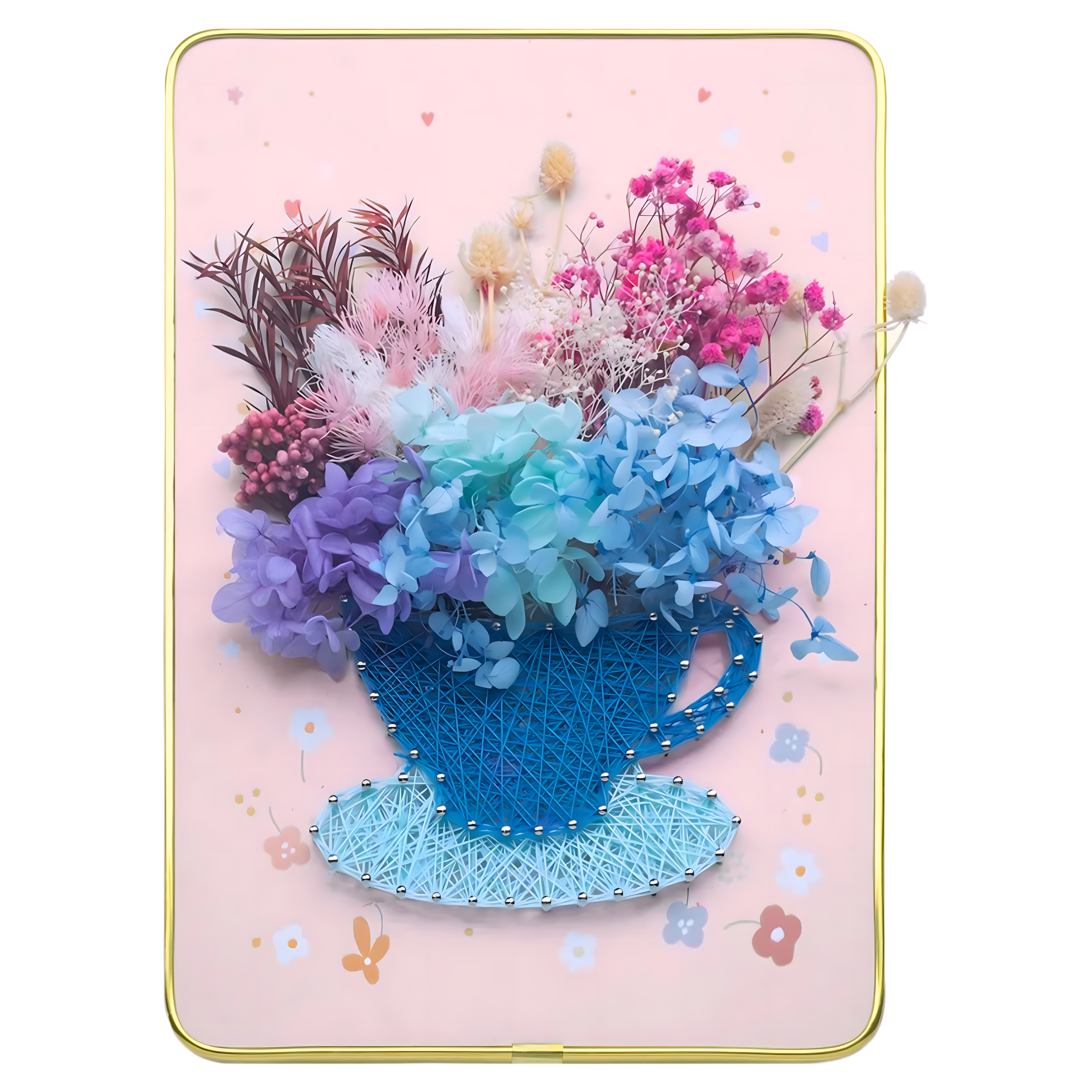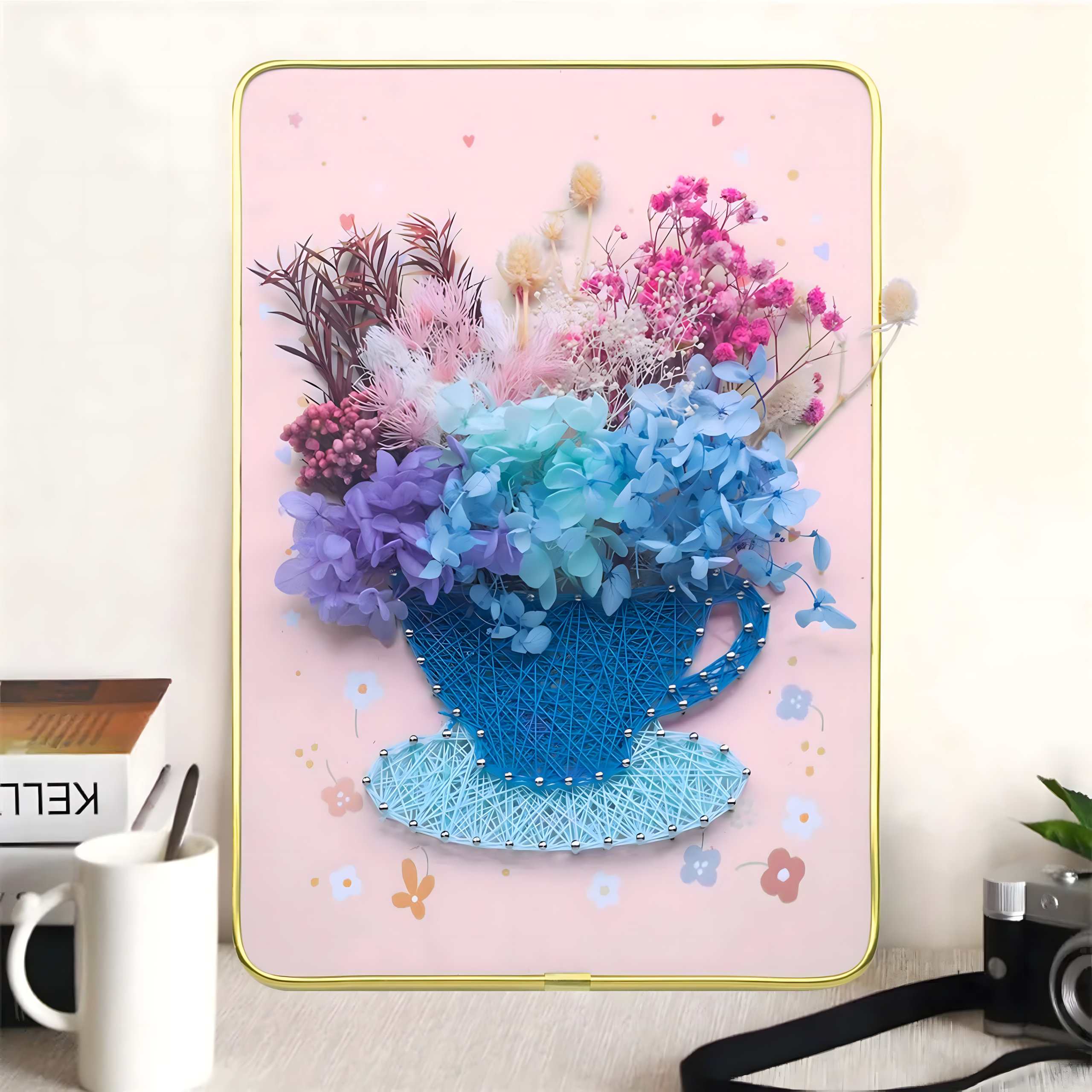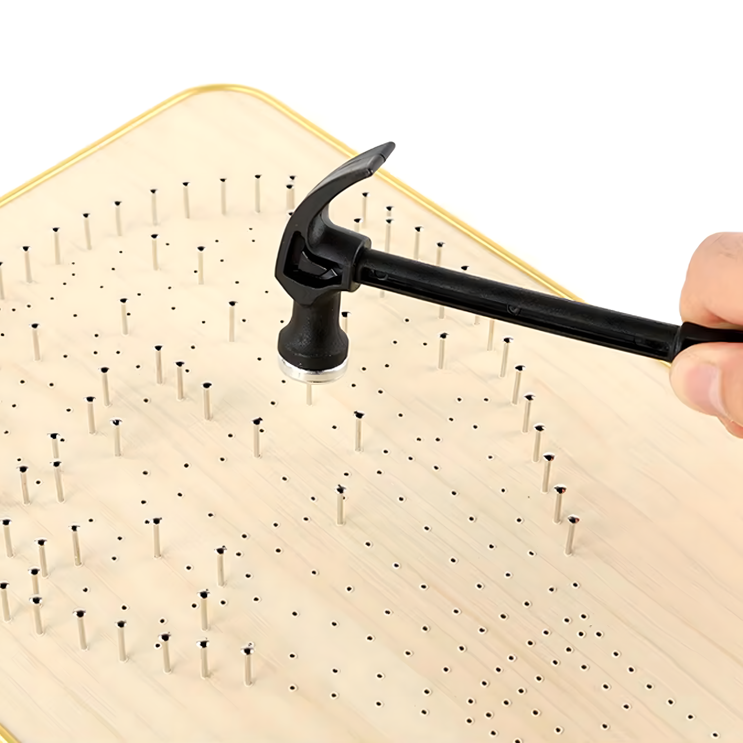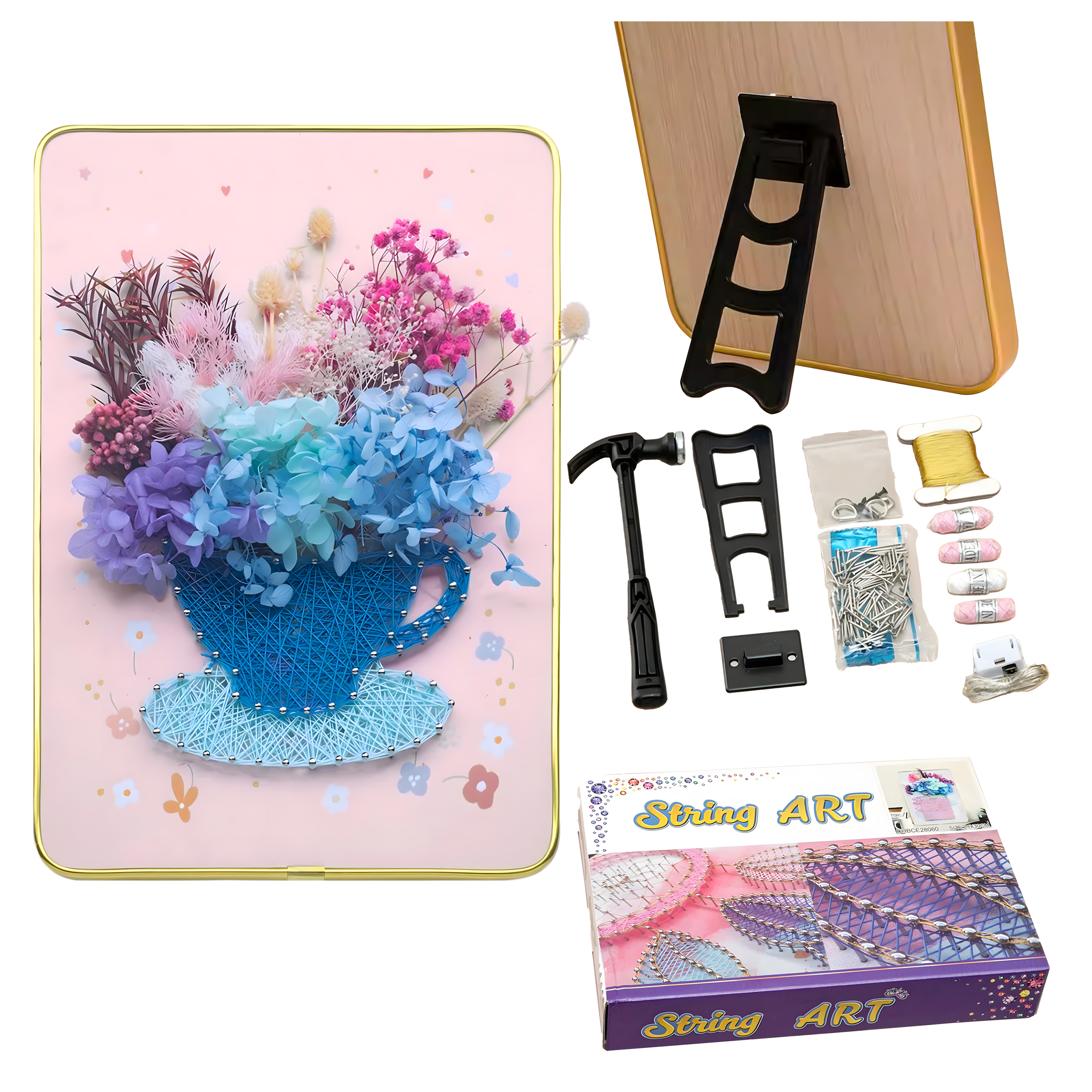 Proces tworzenia polega na wbijaniu małych gwoździ w drewniane podłoże zgodnie z wybranym wzorem, a następnie owijaniu wokół nich nici lub sznurka. Powstające na powierzchni obrazki charakteryzują się trójwymiarowym efektem i unikalnym wzornictwem. Gotowe prace można zawiesić na ścianie lub ustawić na półce, korzystając z dołączonej podpórki.