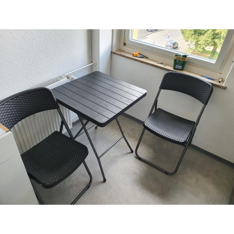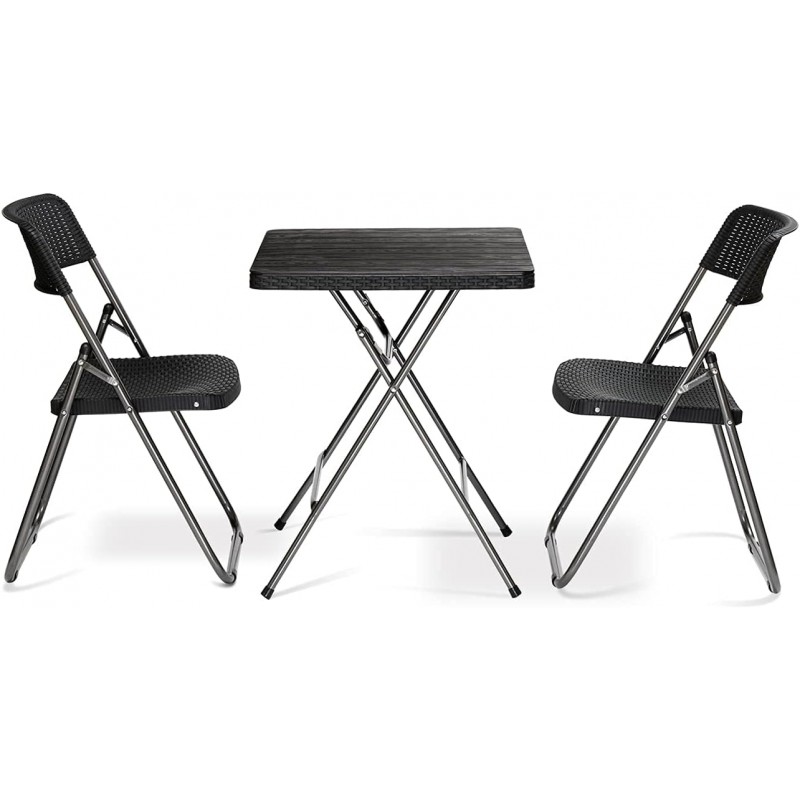 Kompaktowy zestaw ogrodowy stół z krzesłamiPraktyczny i uniwersalny zestaw na balkon, taras czy do ogrodu.Bardzo praktyczny i lekki. Specyfikacja:STÓŁ:- Wymiary stołu: 60×60 cm, wysokość 73 cm.- Stabilna i trwała konstrukcja.- Blat wykonany z mocnego tworzywa sztucznego PP imitującego drewno.- Nośność stołu: 70 kg.KRZESŁO:- Szerokość 46 cm, wysokość: 84 cm, głębokość 53 cm.- Maksymalne obciążenie 120 kg.Specyfikacja zestawu:- Zestaw zawiera dwa krzesła oraz stół.- Materiał wodoodporny, odporny przed promieniowaniem UV.- Produkty wykonane z ramy żelaznej oraz tworzywa sztucznego PP imitującego ratan.- Krzesła i stół są składane, dzięki czemu zajmują niewiele miejsca podczas przechowywania.Wymiary opakowania:106 x 62 x 15,5 cmWaga: 10,5 kg netto / 11,5 kg brutto