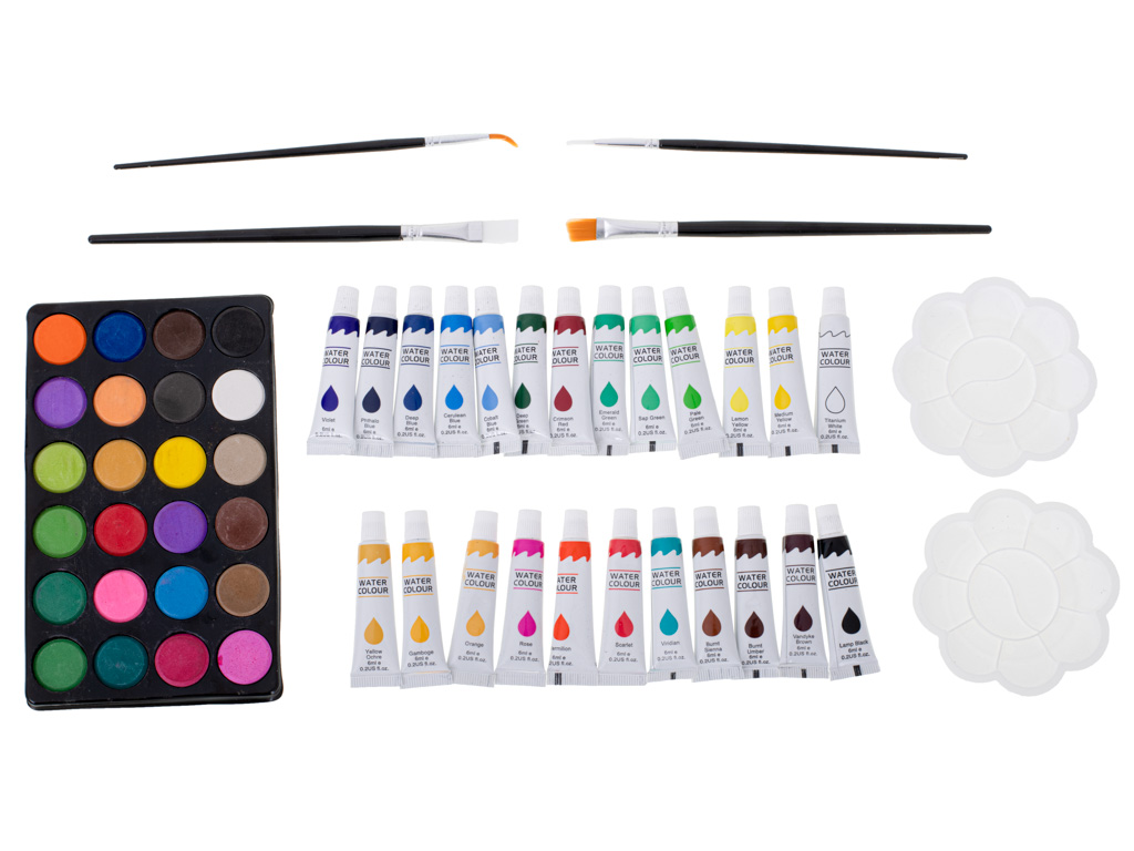 szeroki wybór przyrządów, takich jak: ołówki, mazaki, kredki, farb akwarelowe,