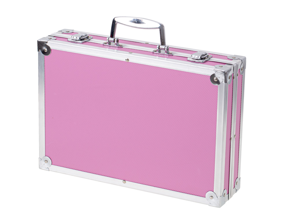 różowa walizka w której znajdują się same niezbędne rzeczy do tworzenia własnych