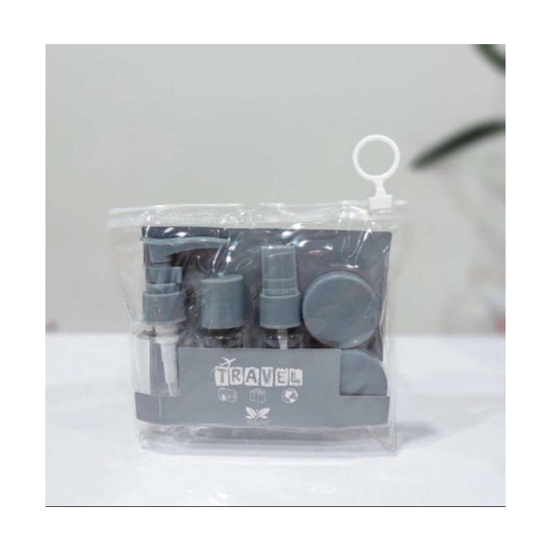 7-częściowy zestaw buteleczek i pojemniczków, specjalnie zaprojektowanych do przewożenia kosmetyków w podróży.