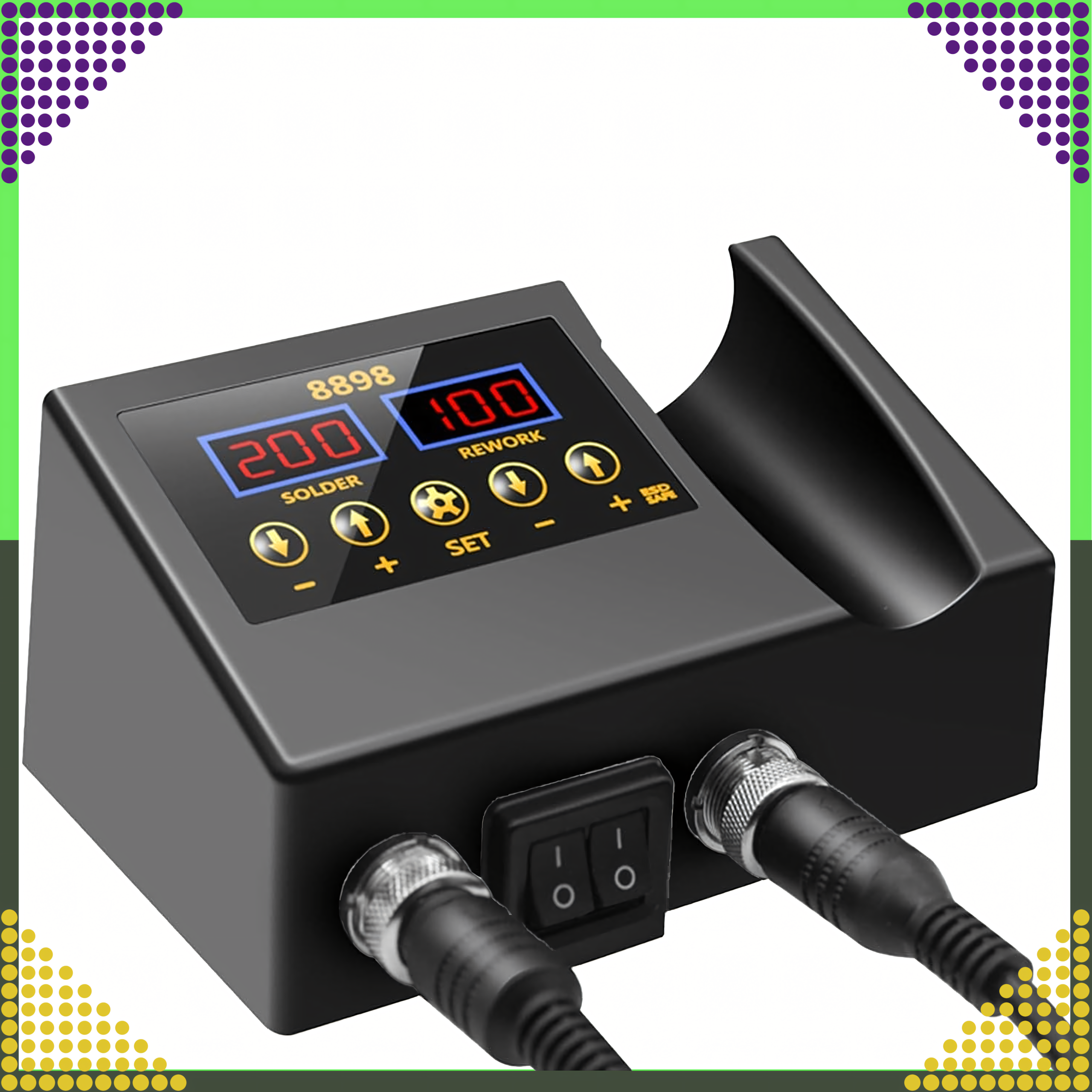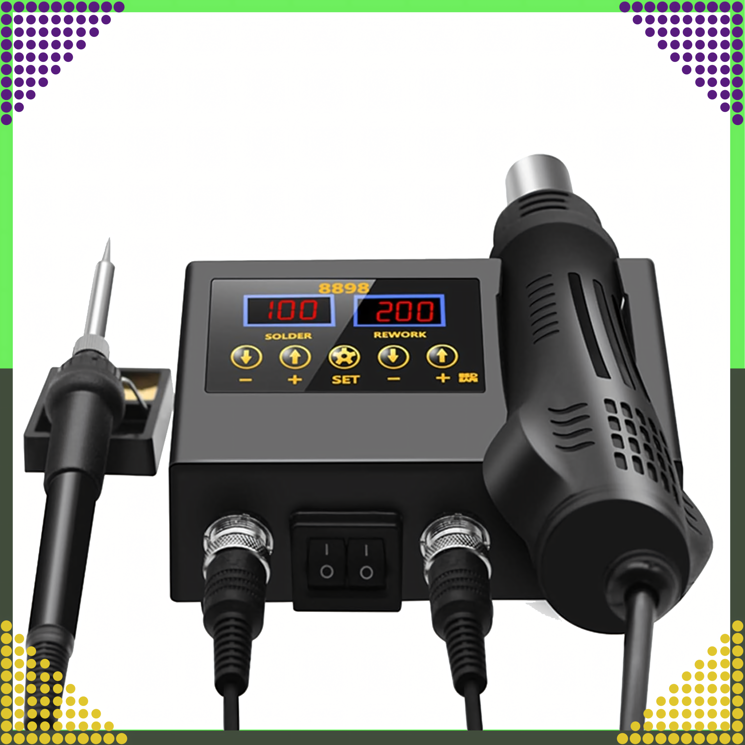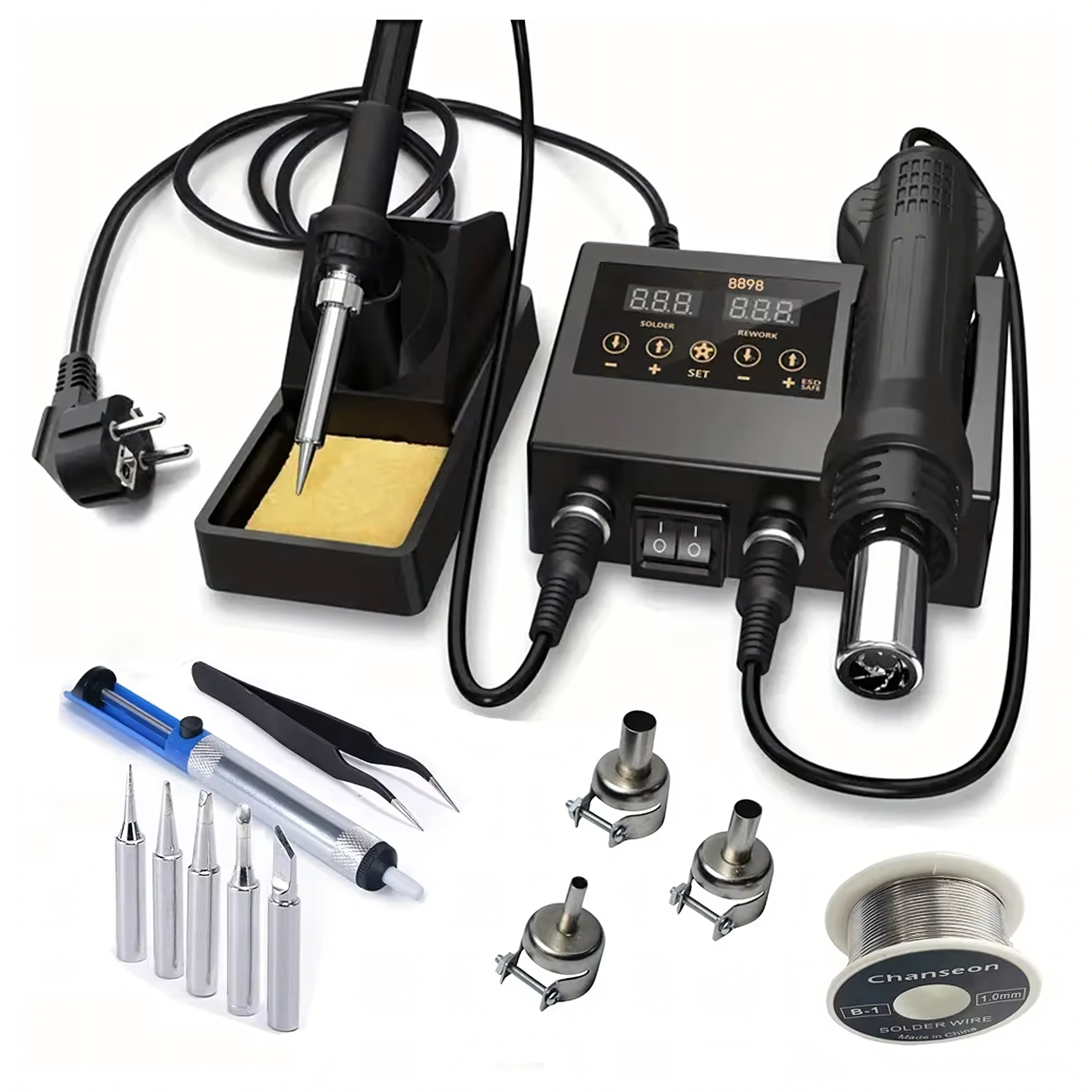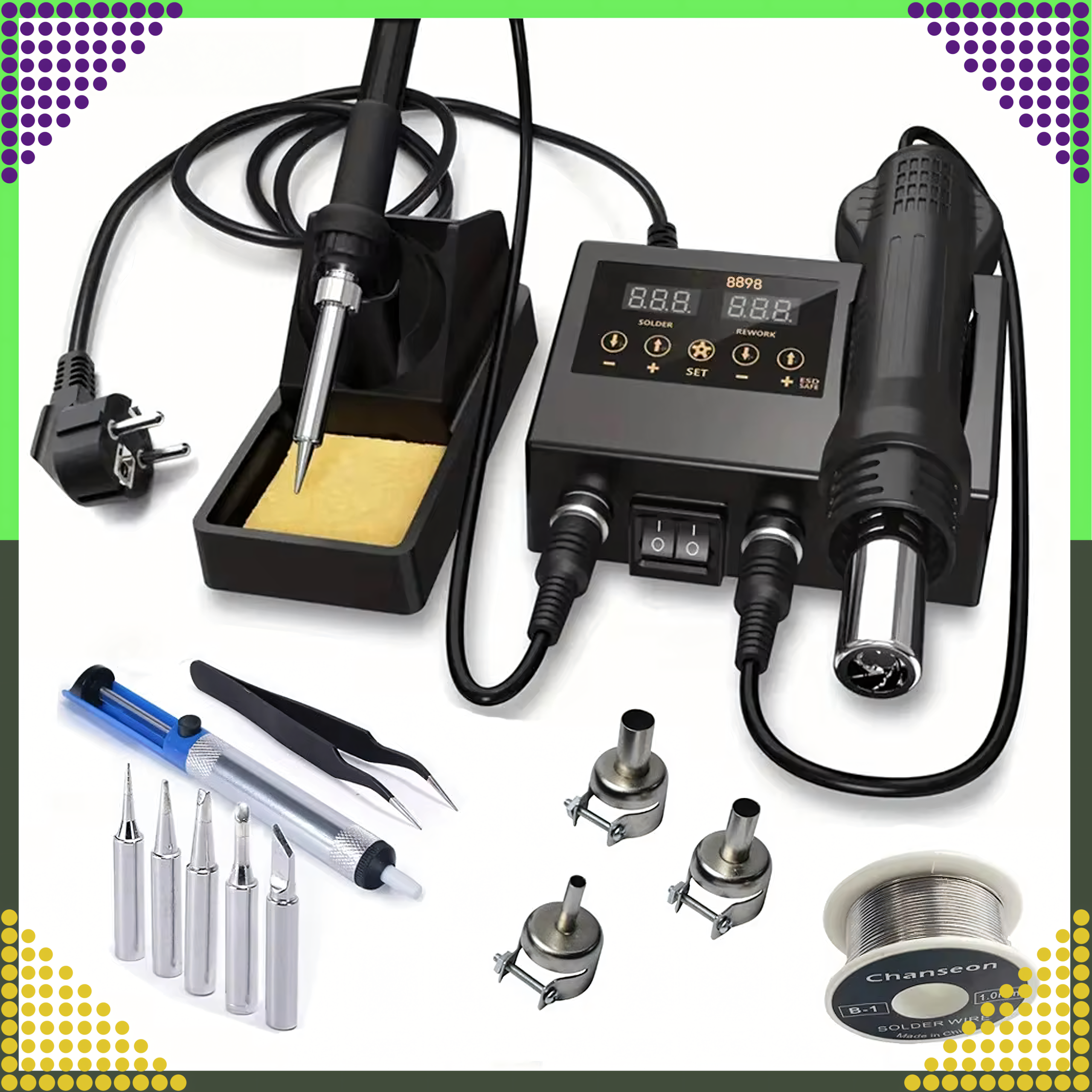 Zestaw Stacja Lutownicza 8898 2w1 to kompletny i zaawansowany zestaw, który łączy funkcję lutownicy grotowej i gorącego powietrza, umożliwiając wykonywanie szerokiego zakresu prac elektronicznych, naprawczych i montażowych. Idealny do lutowania, naprawy komponentów elektronicznych oraz usuwania elementów SMD.