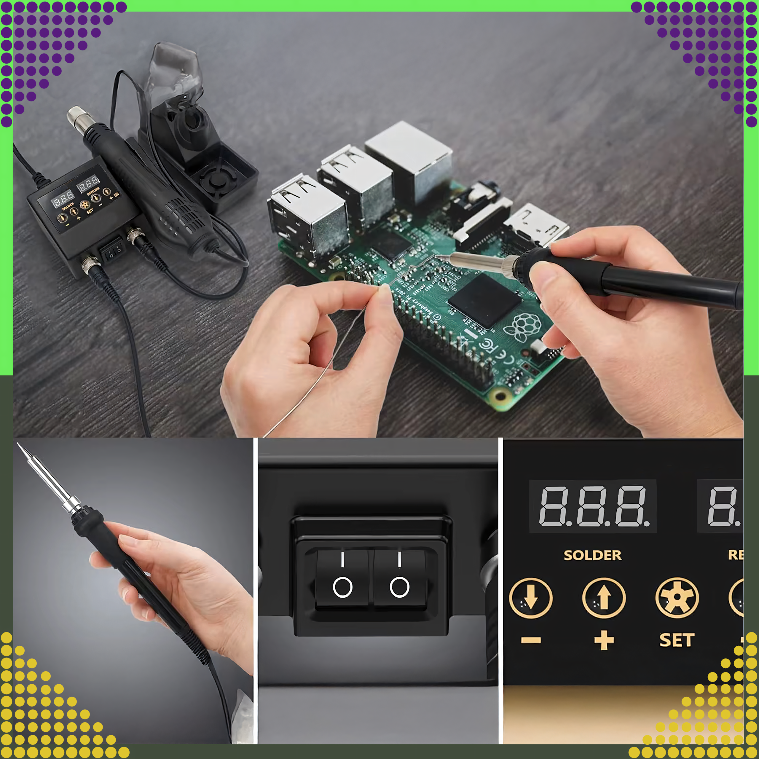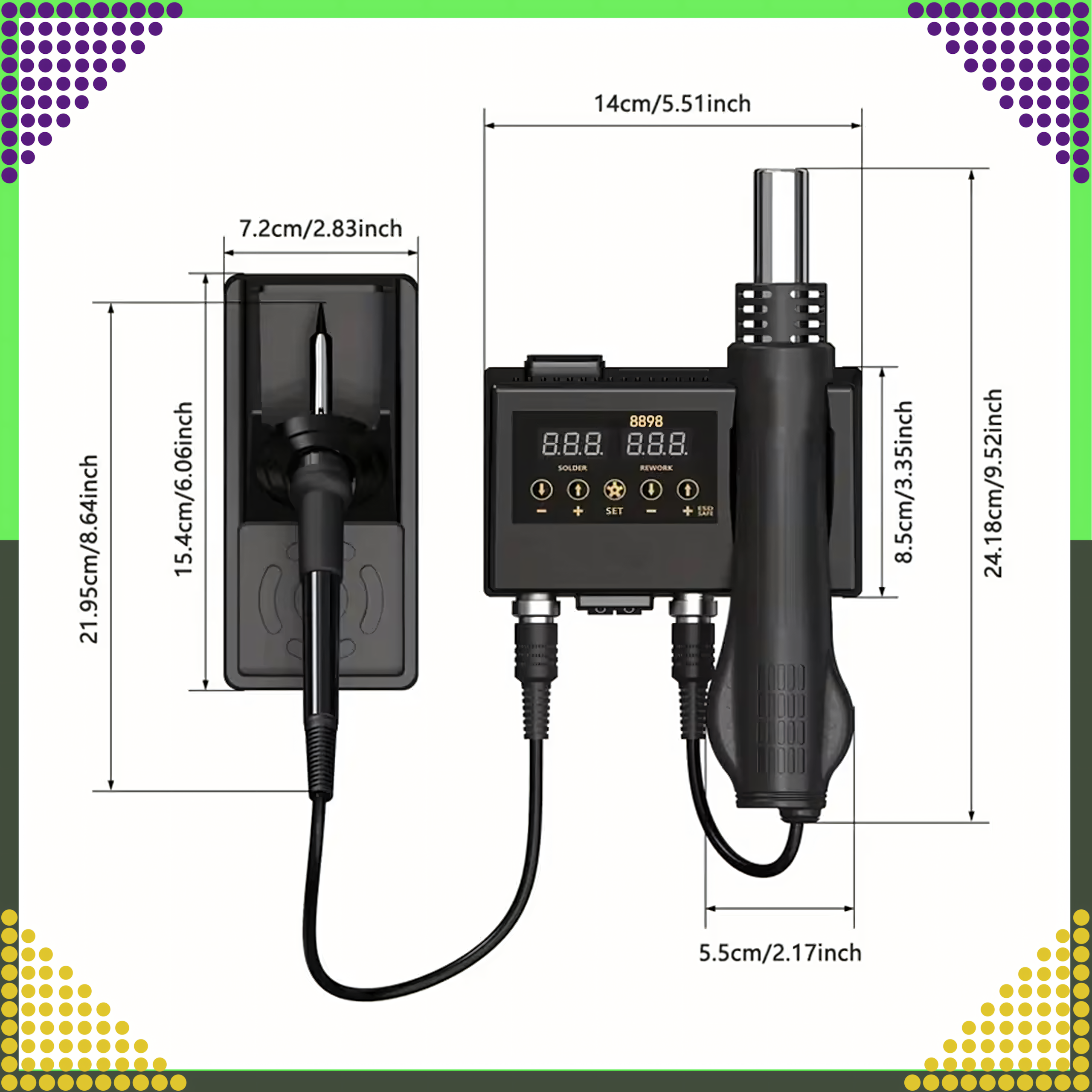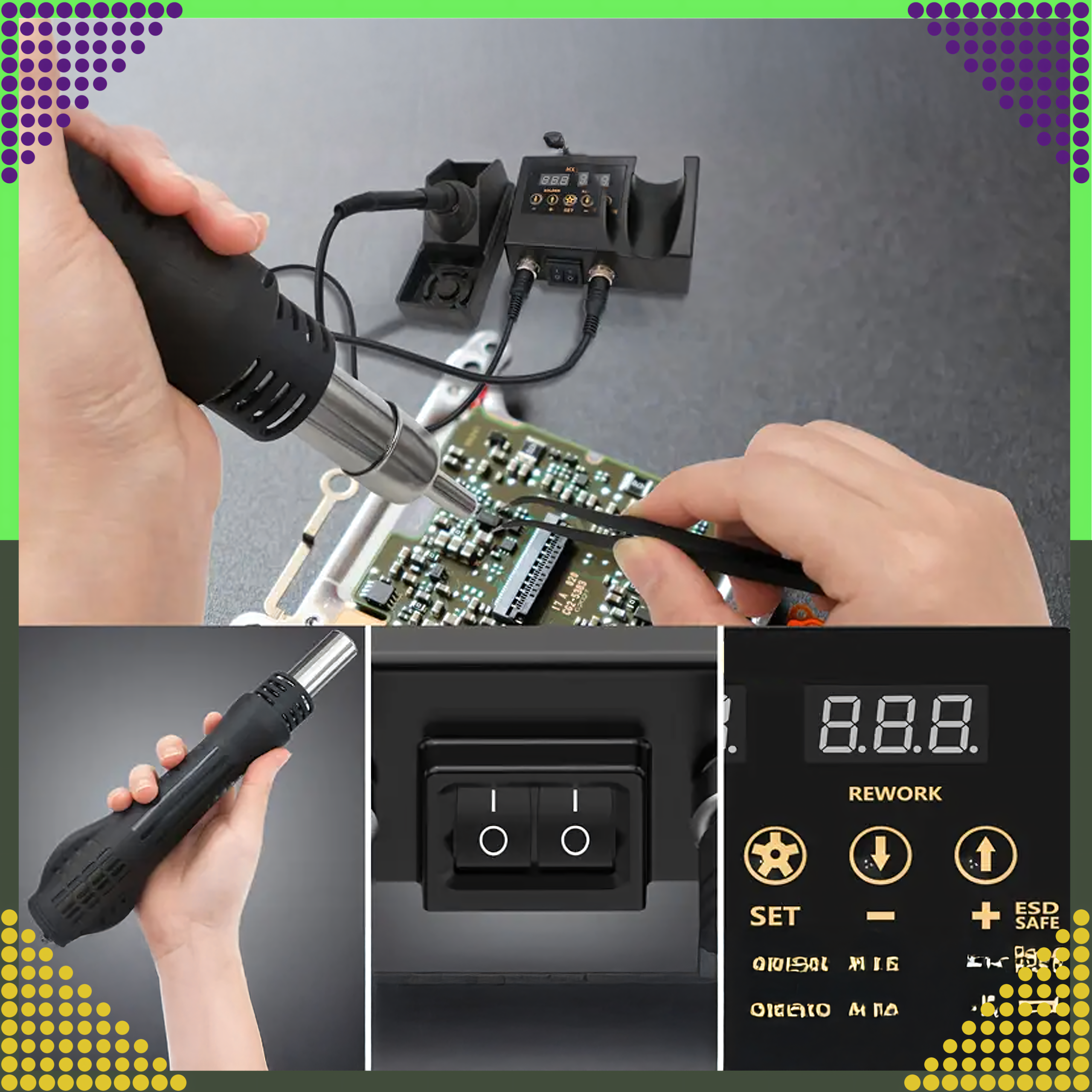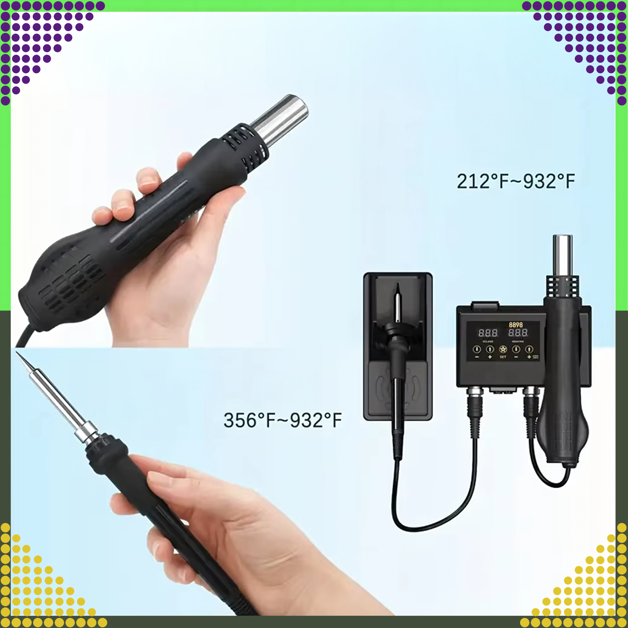 Zestaw Stacja Lutownicza 8898 2w1 to kompletny i zaawansowany zestaw, który łączy funkcję lutownicy grotowej i gorącego powietrza, umożliwiając wykonywanie szerokiego zakresu prac elektronicznych, naprawczych i montażowych. Idealny do lutowania, naprawy komponentów elektronicznych oraz usuwania elementów SMD.