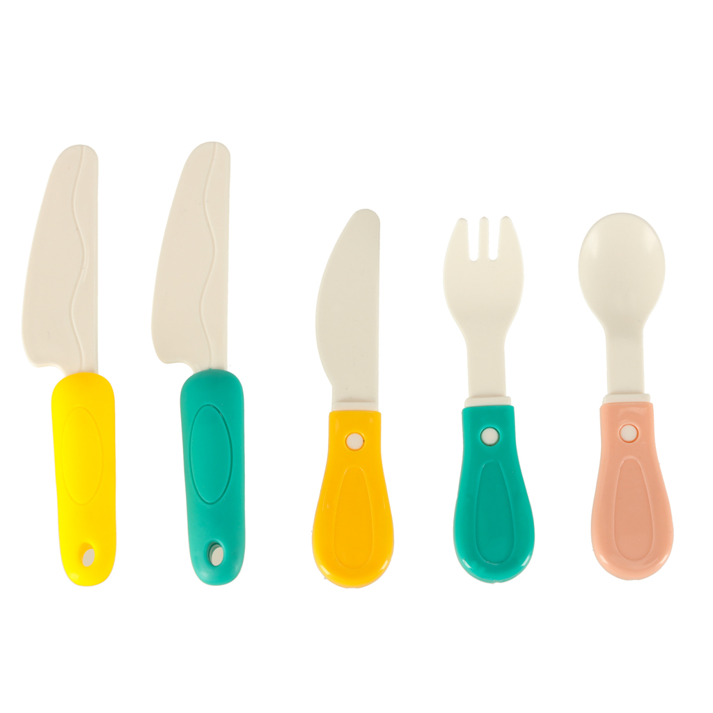 zawiera szereg akcesoriów: plastikowy nóż, tace, talerze i sztućce, które