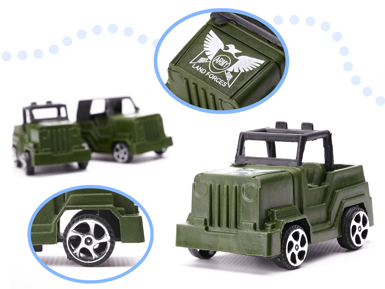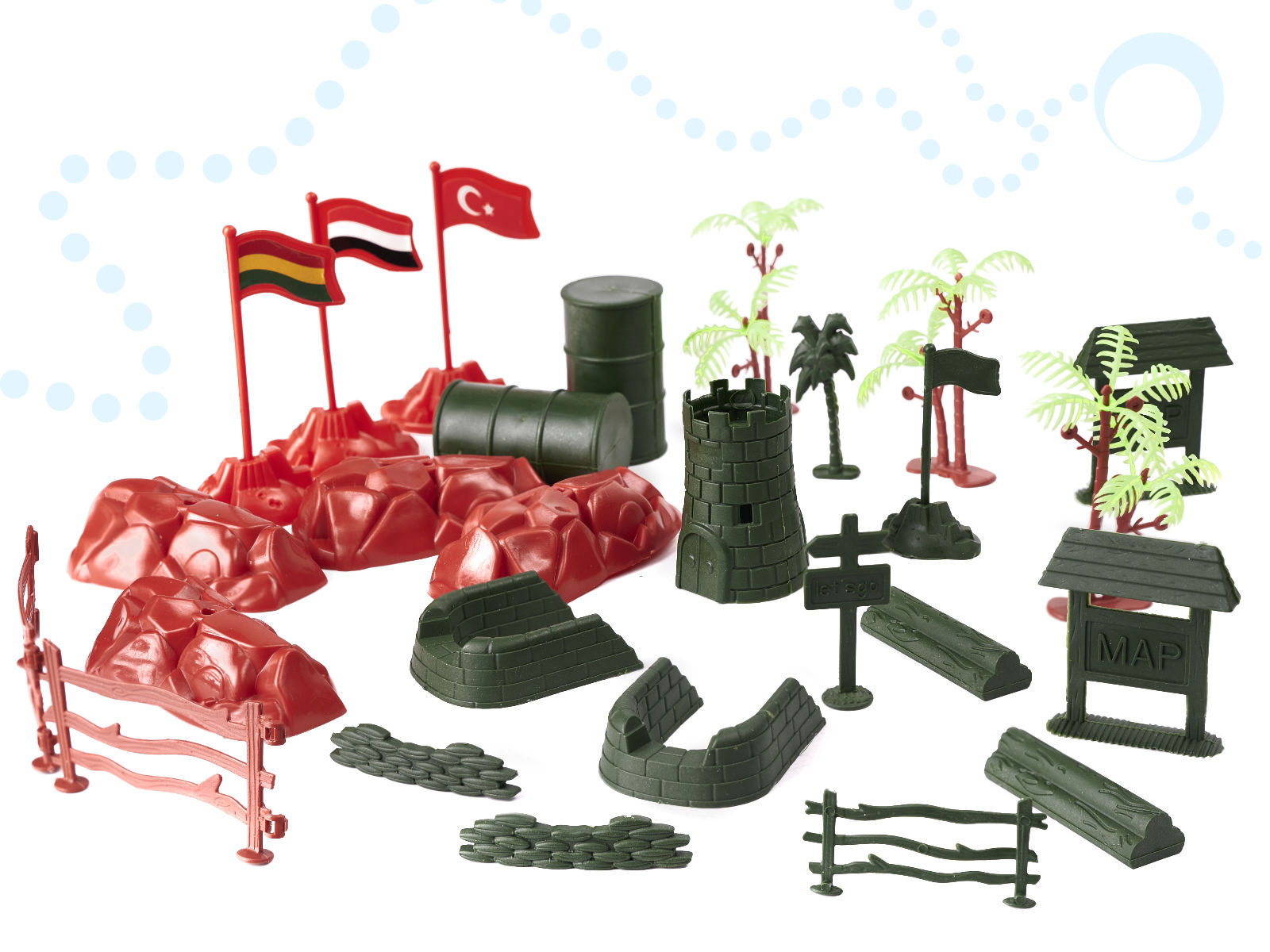 Rewelacyjny zestaw figurek do bazy wojskowej. Prawdziwa gratka dla małych miłośników wojska. Idealny dla dzieci kreatywnych o dużej wyobraźni. W zestawie: ok. 240 żołnierzyków, czołgi, samochody, myśliwce, drzewa, rakiety, broń. Wym. czołgu: 7×3,5×2,5cm.
