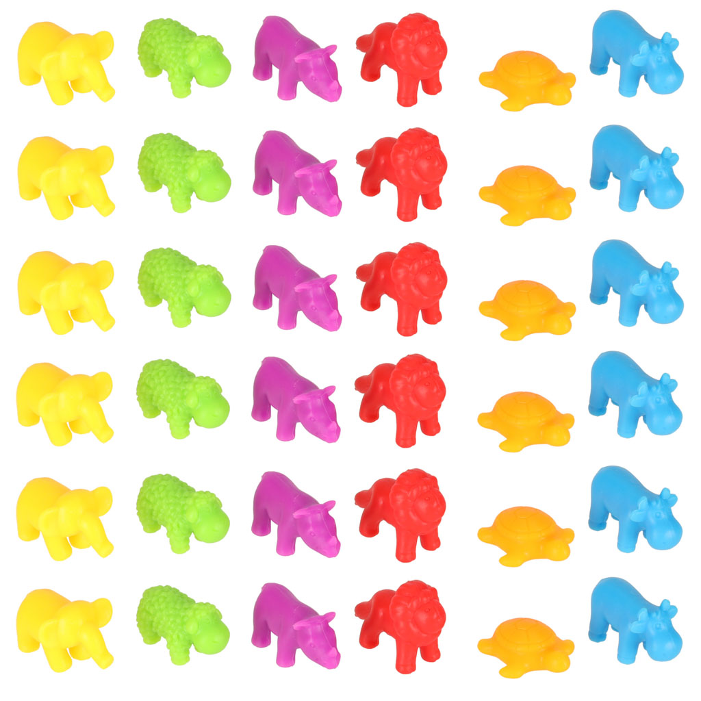 Super zestaw do nauki liczenia. Skradnie serce każdego malucha. Łączy naukę i zabawę. Zabawa zwierzątkami pobudza wyobraźnię i zachęca do kreatywnego myślenia. Tworzywo: plastik. W zestawie: 6 kubeczków, 2x szczypce, 36 zwierzątek. Dł. szczypiec: 9,5cm.
